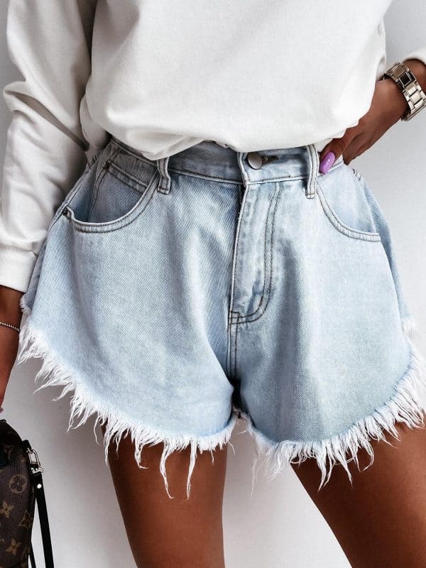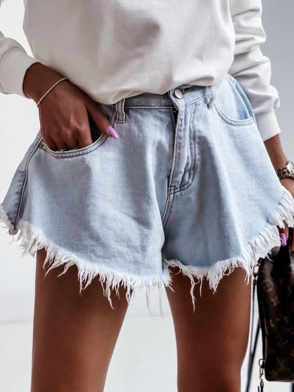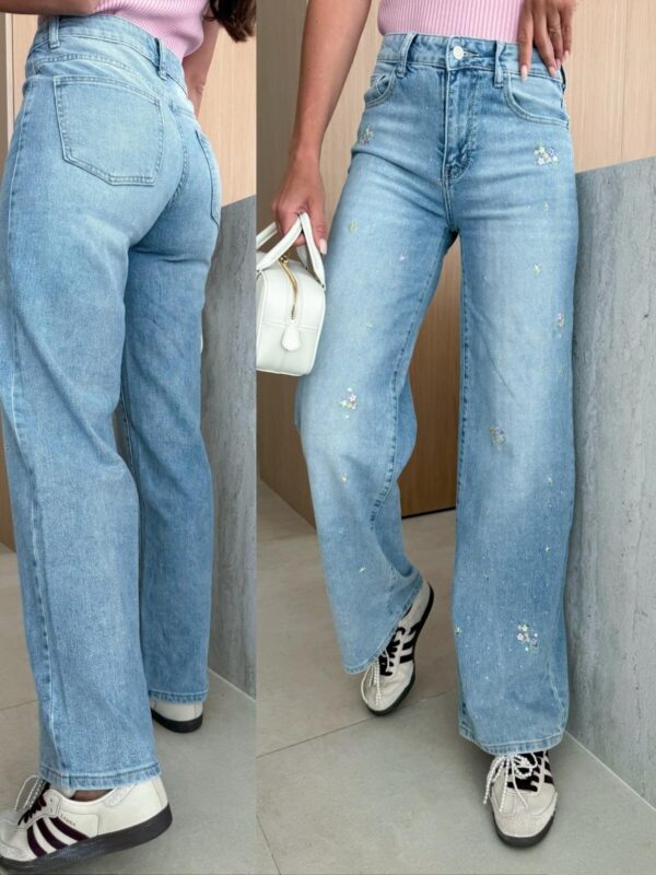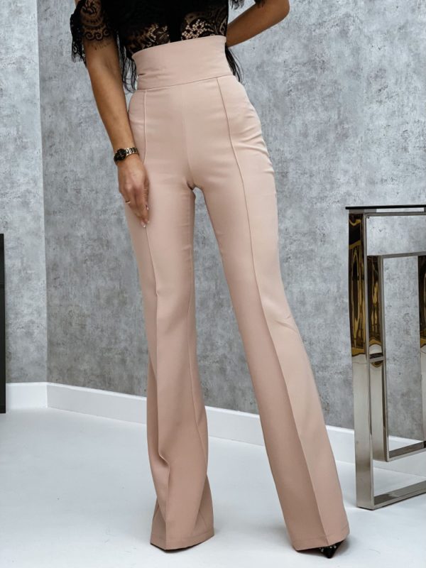 Hladký povrch, elastická tkanina. Stredne vysoký strih. Široké nohavice.