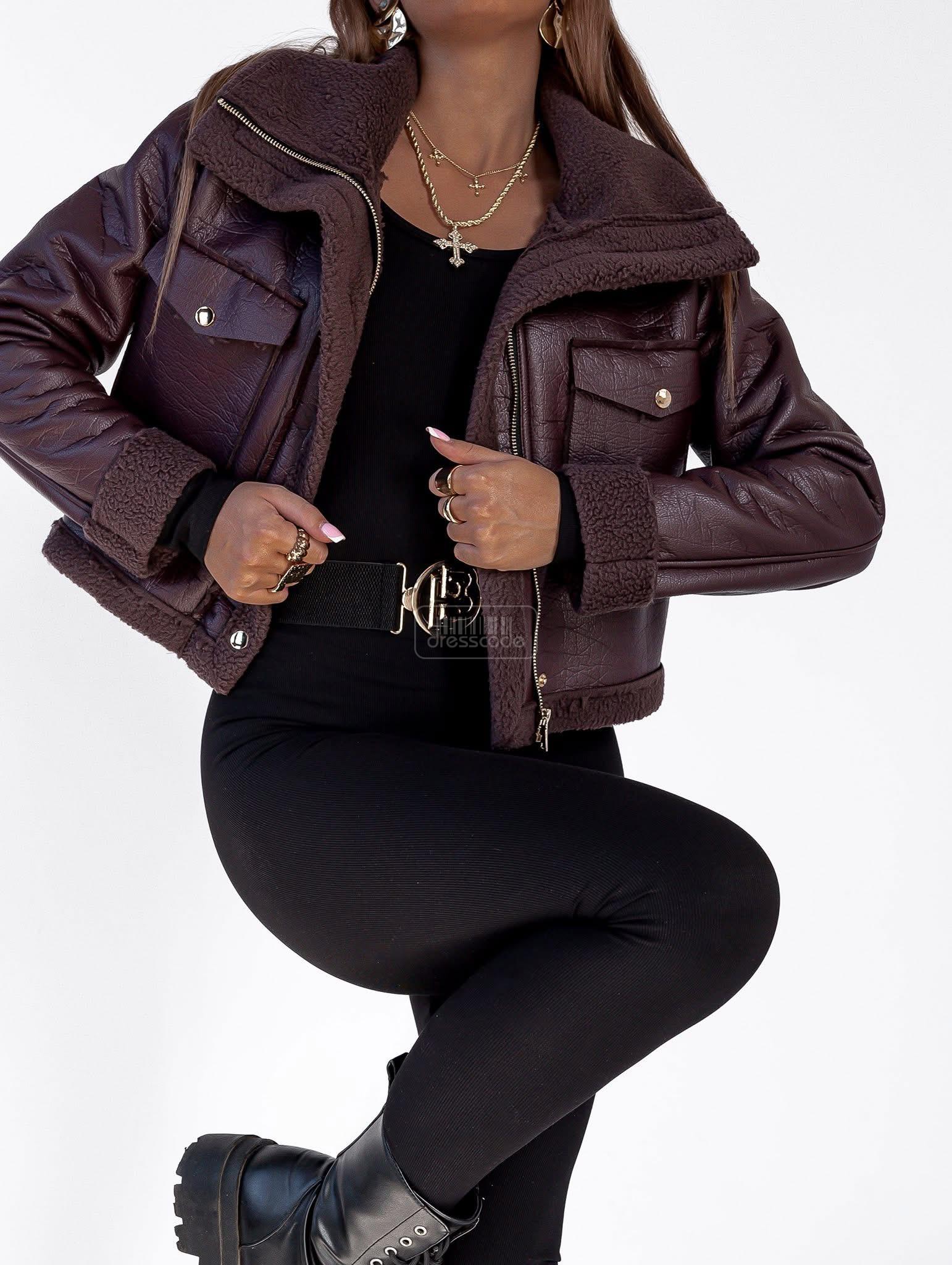 Tmavá farba robí z tejto bundy perfektný doplnok ku každému outfitu – od ležérnych džínsov až po elegantné šaty. Mäkká kožušinová podšívka a golier poskytujú útulné teplo aj v chladnejších dňoch.