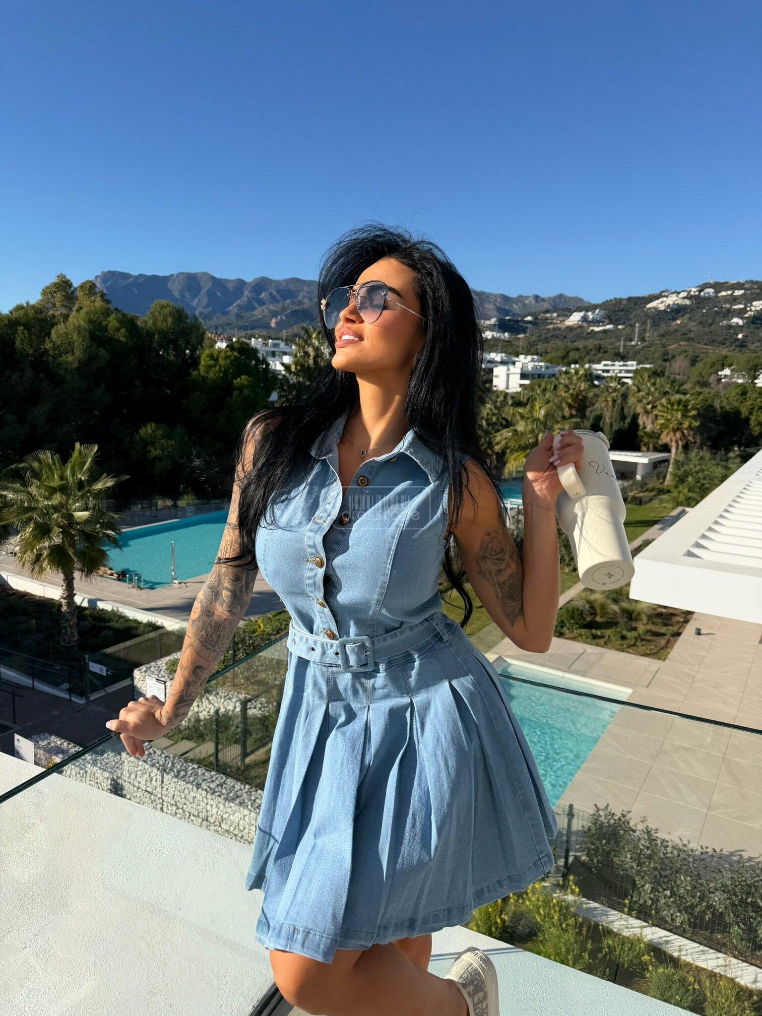 Tieto rifľové šaty sa vyznačujú výrazným skladaným lemom a mierne rozšírenou siluetou, ktorá krásne splýva s pohybom. Šaty sú dodávané s opaskom, ktorý zvýrazňuje pás. Sú vyrobené z elastickej, pohodlnej látky s nádychom bavlny, kombinujú štýlový vzhľad s pohodlím, ideálne na každodenné nosenie a jarné/letné outfity.