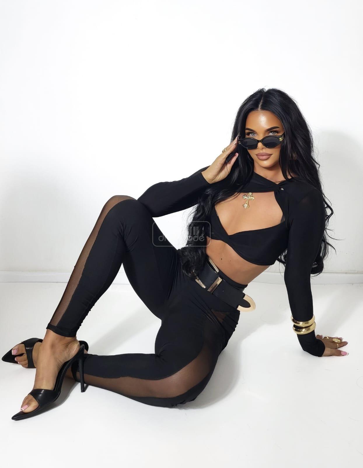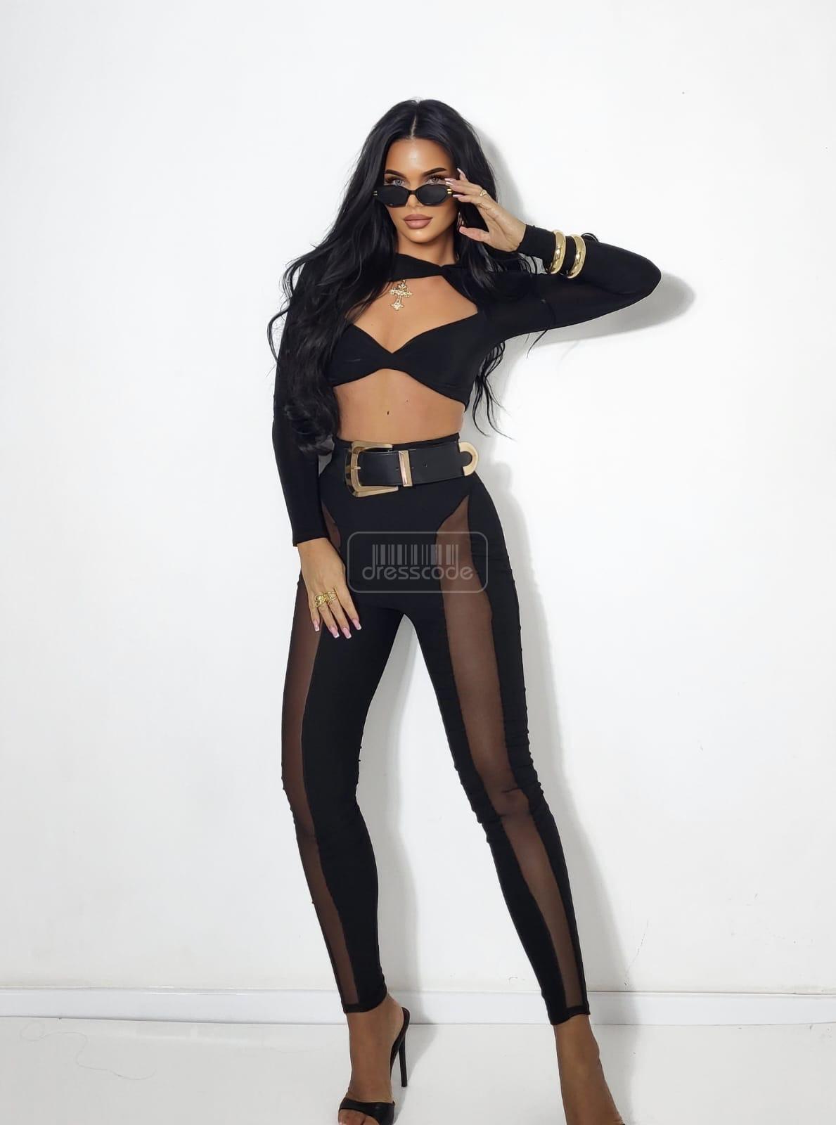 Jedinečná kombinácia priehľadnej látky a hladkej dodáva týmto legínam výrazný a zároveň elegantný charakter. Kontrastné textúry jemne tvarujú nohy a odlišujú ich od klasických legín.