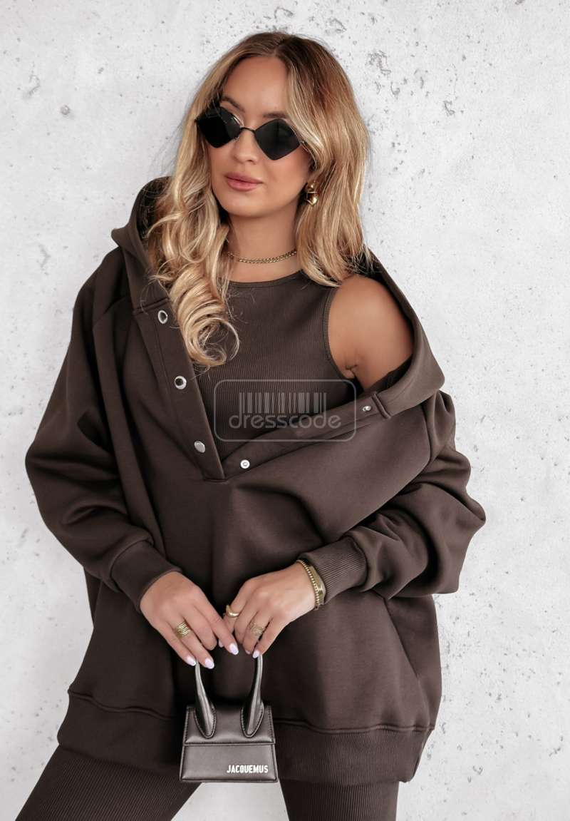 Súprava 3v1 sa skladá z mikiny, topu a legín s rebrovanou úpravou. Tento model je ideálny na každodenné nosenie, pretože je vyrobený z príjemnej a príjemnej látky. Noste spolu alebo oddelene.