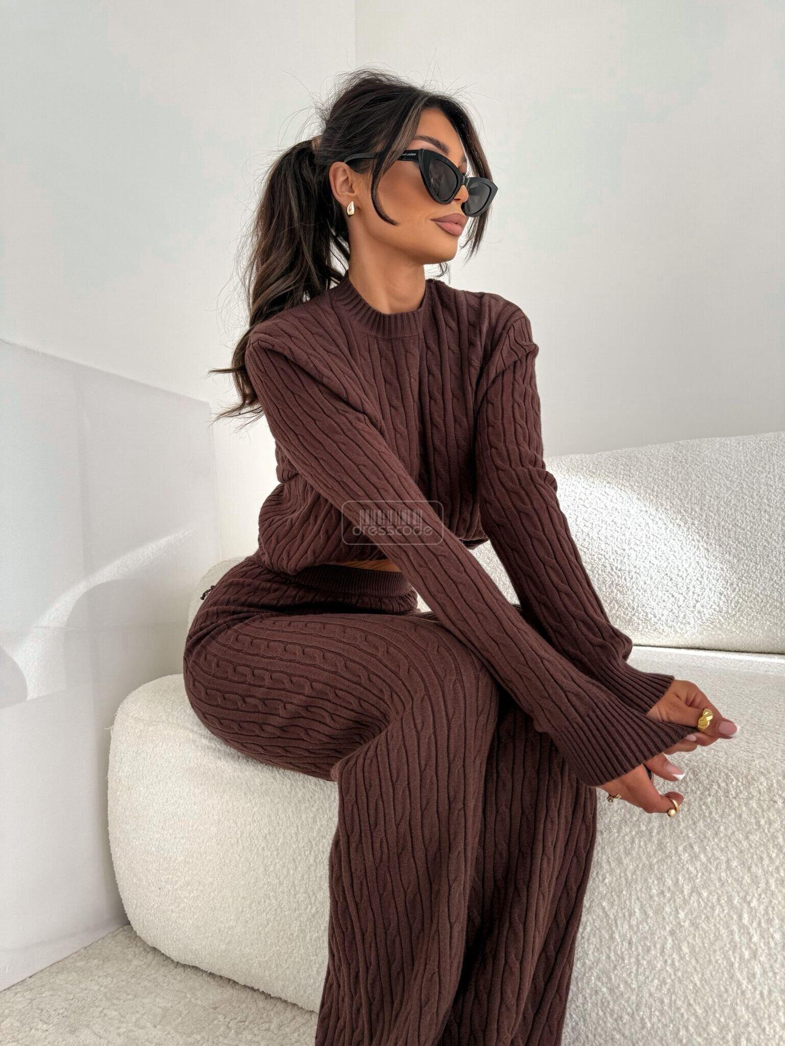 Štýlová pletená súprava 2 v 1, vyrobená z mäkkej, príjemnej na dotyk pleteniny s copánkovým vzorom. Skladá sa z voľného svetra a pohodlných rozšírených nohavíc. Ideálna na každodenné nosenie, prácu na diaľku, cestovanie alebo stretnutia a ponúka pohodlný a zároveň elegantný štýl.