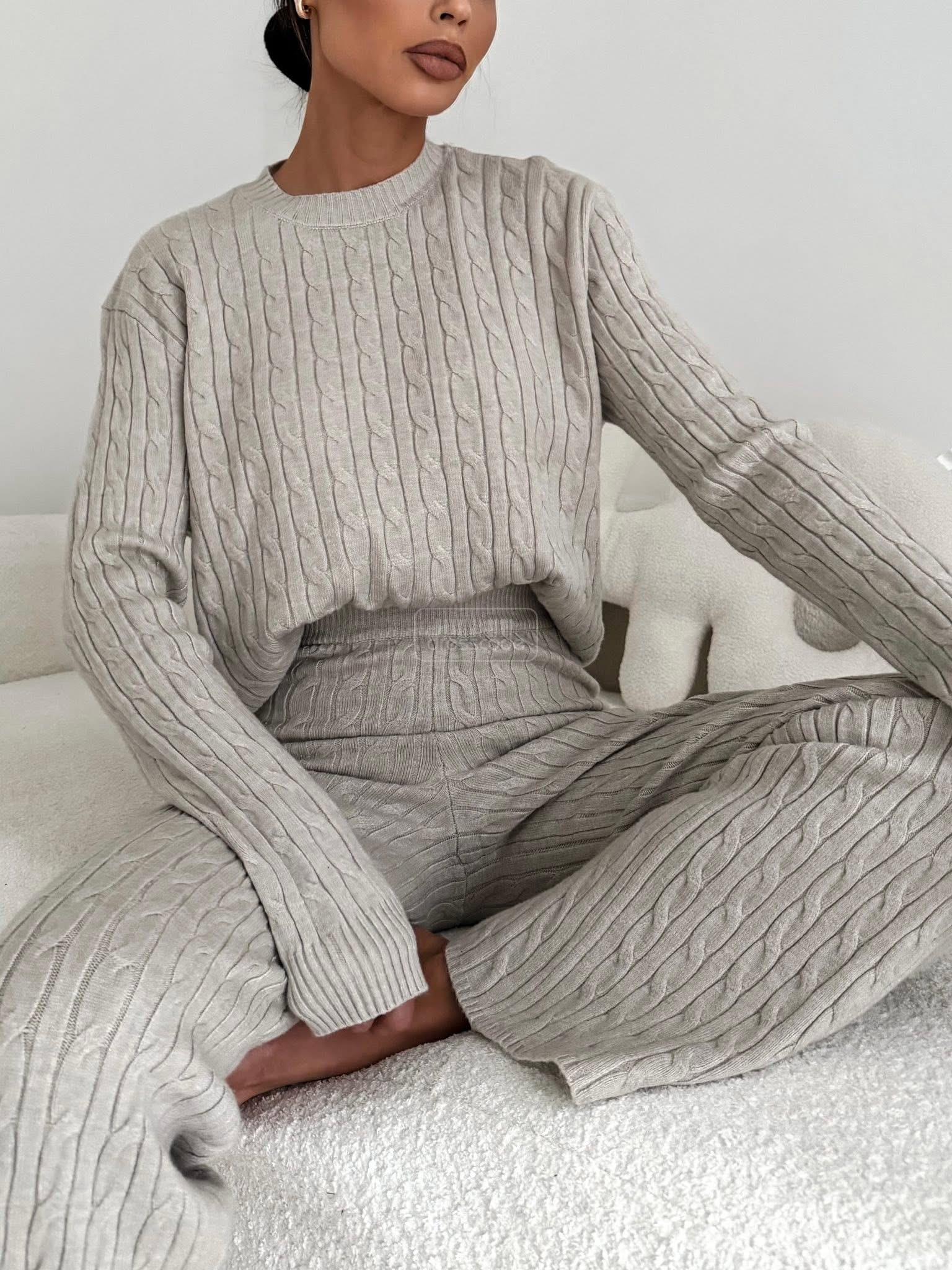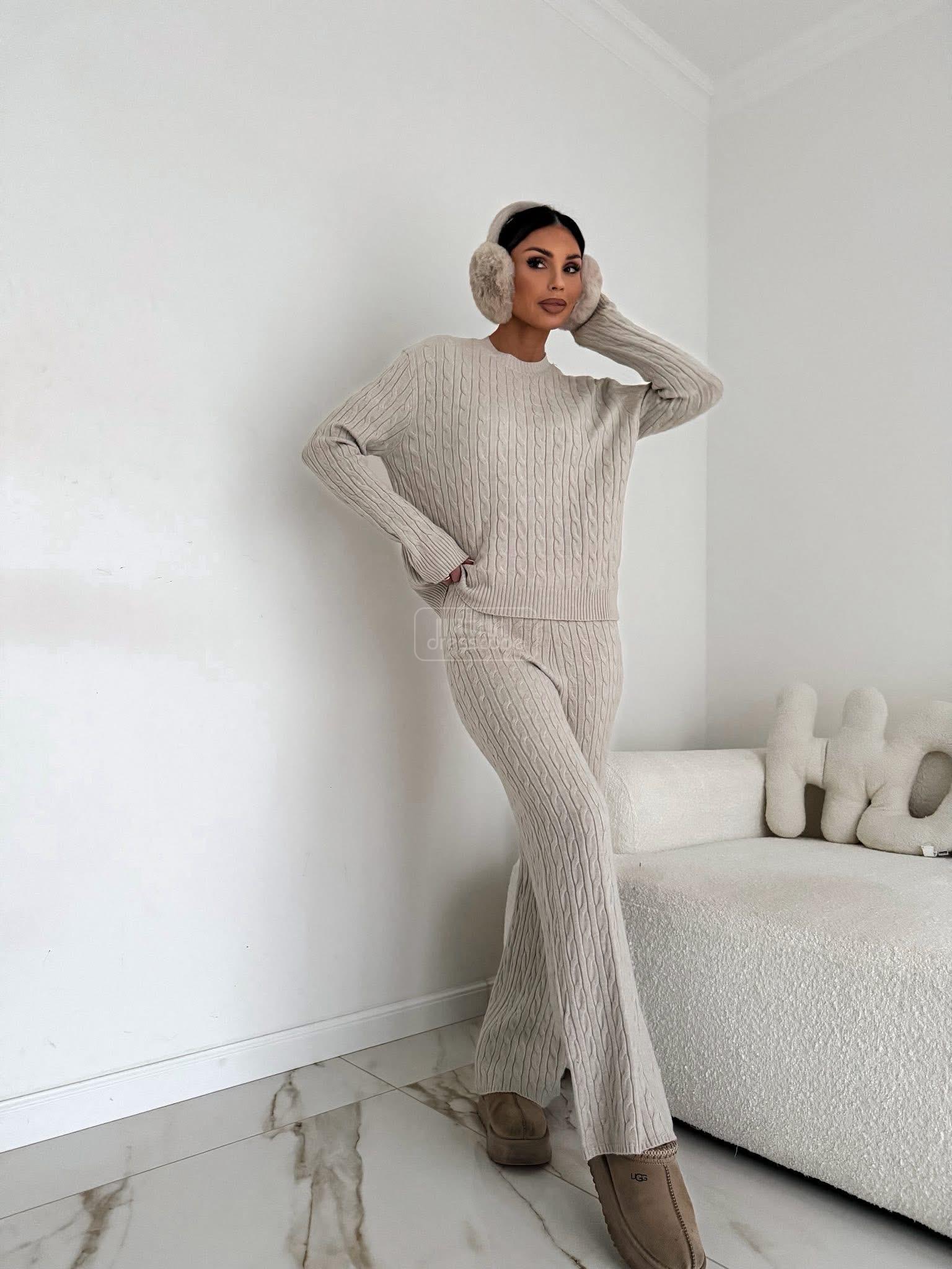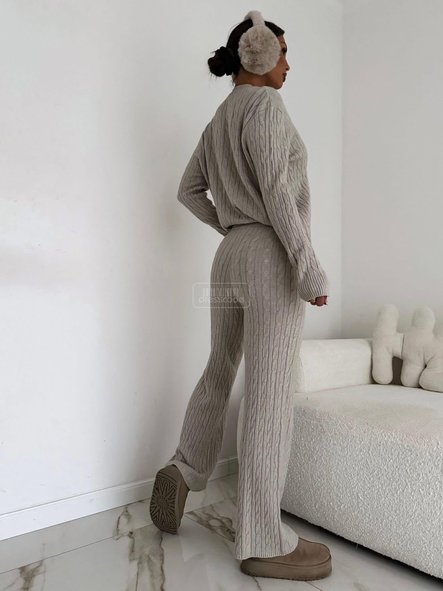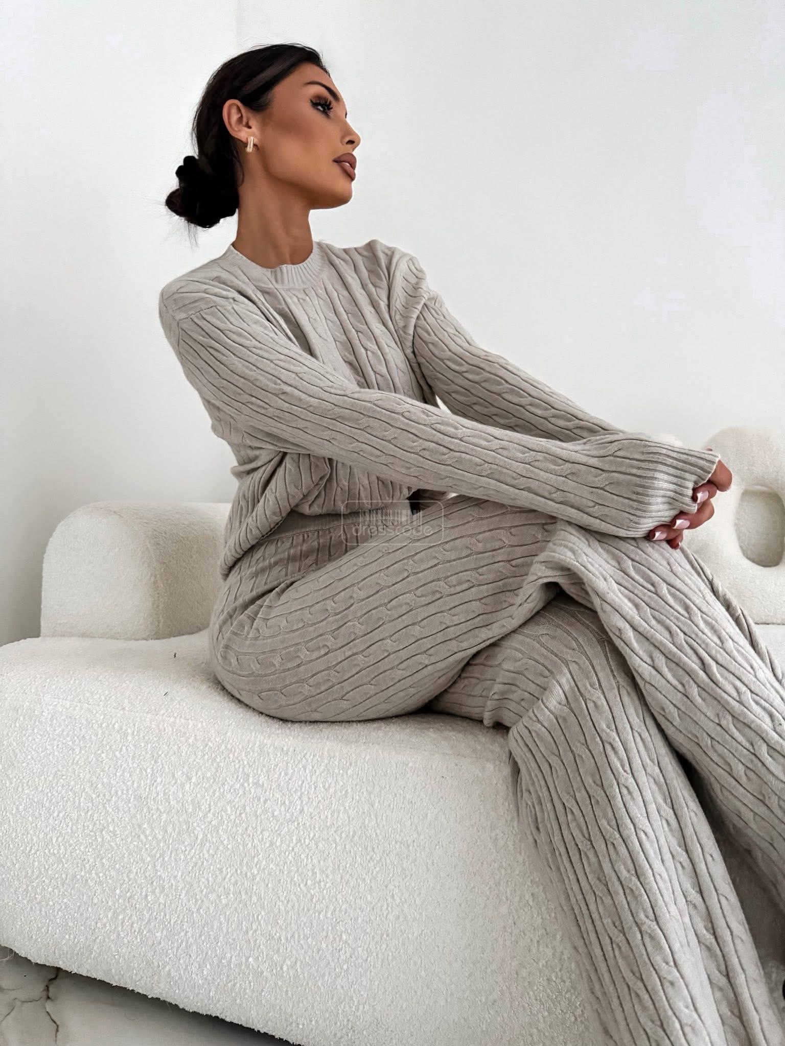 Štýlová pletená súprava 2 v 1, vyrobená z mäkkej, príjemnej na dotyk pleteniny s copánkovým vzorom. Skladá sa z voľného svetra a pohodlných rozšírených nohavíc. Ideálna na každodenné nosenie, prácu na diaľku, cestovanie alebo stretnutia a ponúka pohodlný a zároveň elegantný štýl.