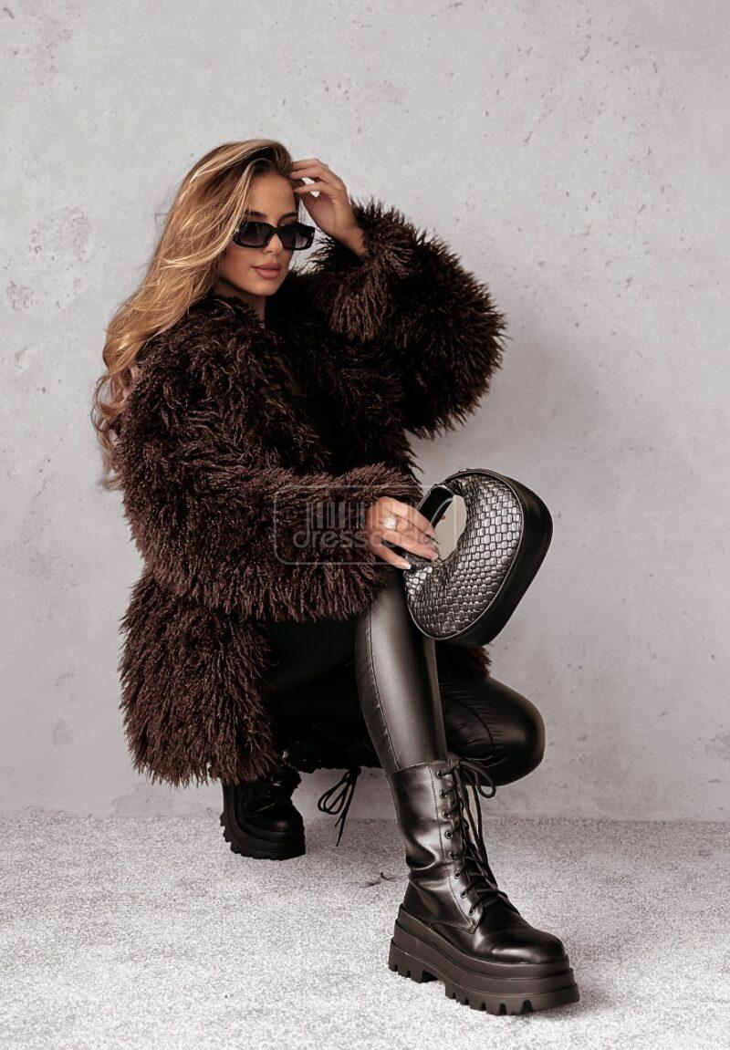 Tento mäkký kožuch je v tejto sezóne skutočne výraznou a módnou voľbou. Vyniká svojím mäkkým, dlhým vlasom. Je to kabát s golierom, ktorý sa zapína na háčiky a očká. Má dlhé rukávy a golier a funkčné vrecká vpredu.