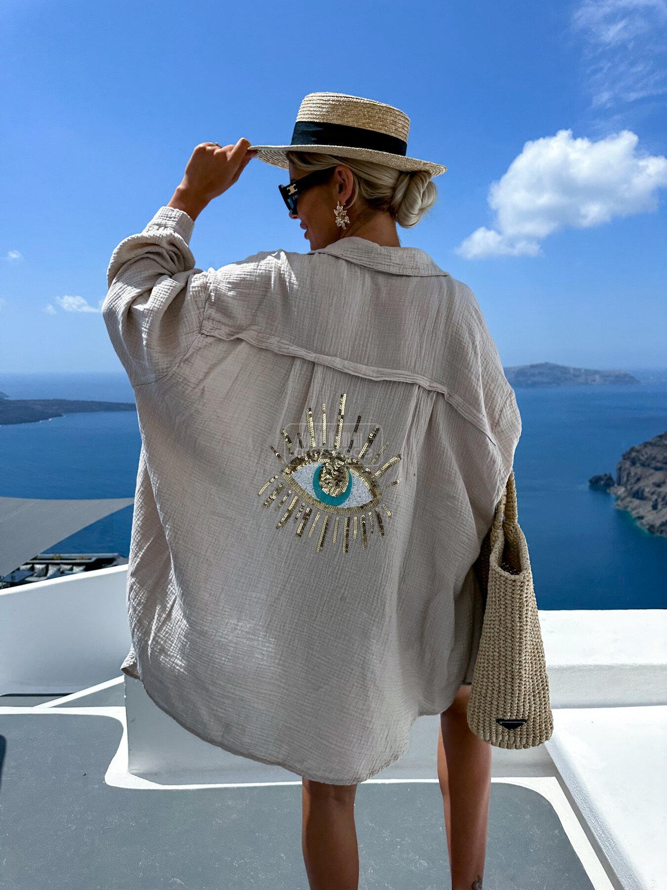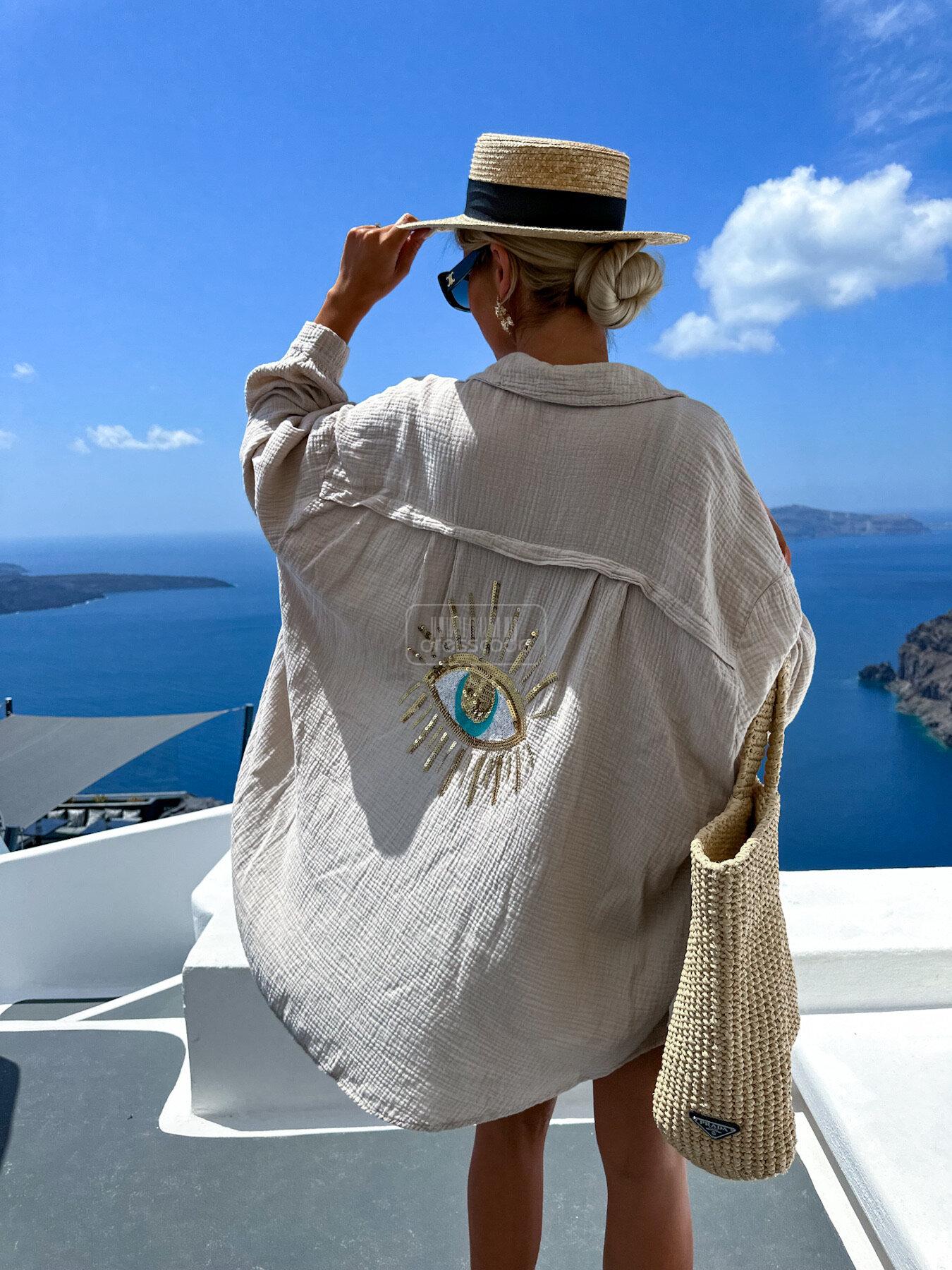 Košeľa oversize strihu je návrhom, ktorý bude fungovať v ležérnych aj náročnejších štylizáciách. Nafúknuté rukávy to celé okorenia. Zapína sa na rad ozdobných gombíkov. Košeľu môžete nosiť aj ako pelerínu alebo ako doplnok k plavkám. Je vyrobená z kvalitnej mušelínovej látky. Aplikácia na zadnej strane vám nepochybne ukradne srdce a upúta pozornosť.