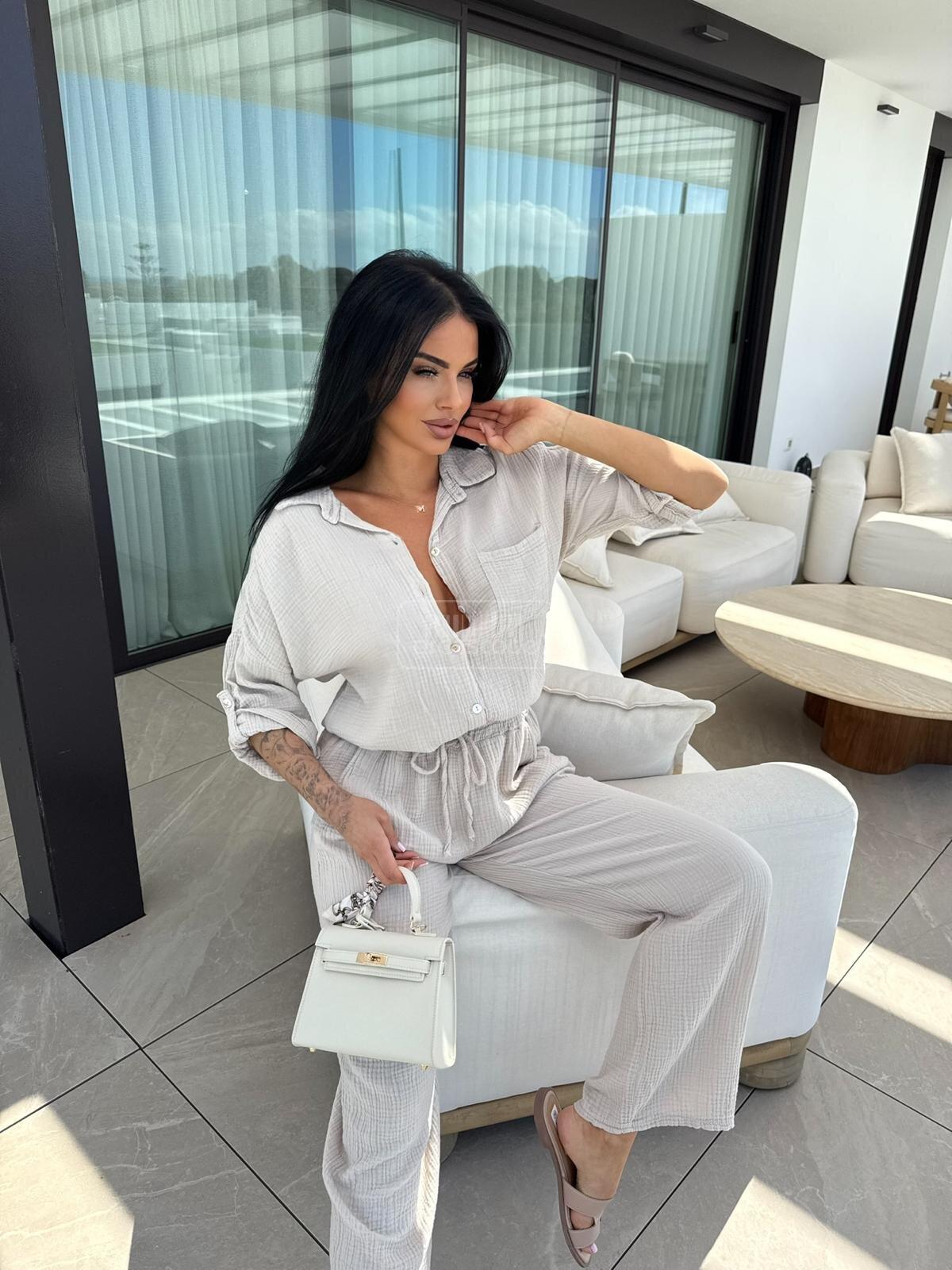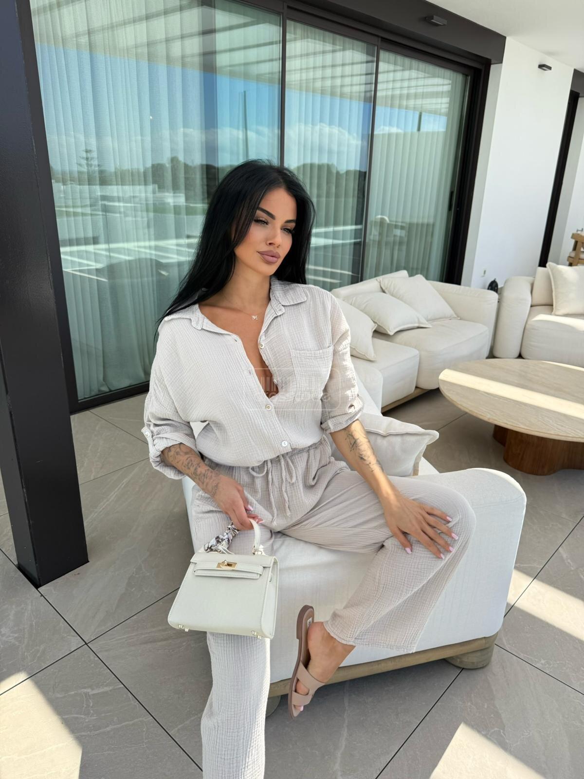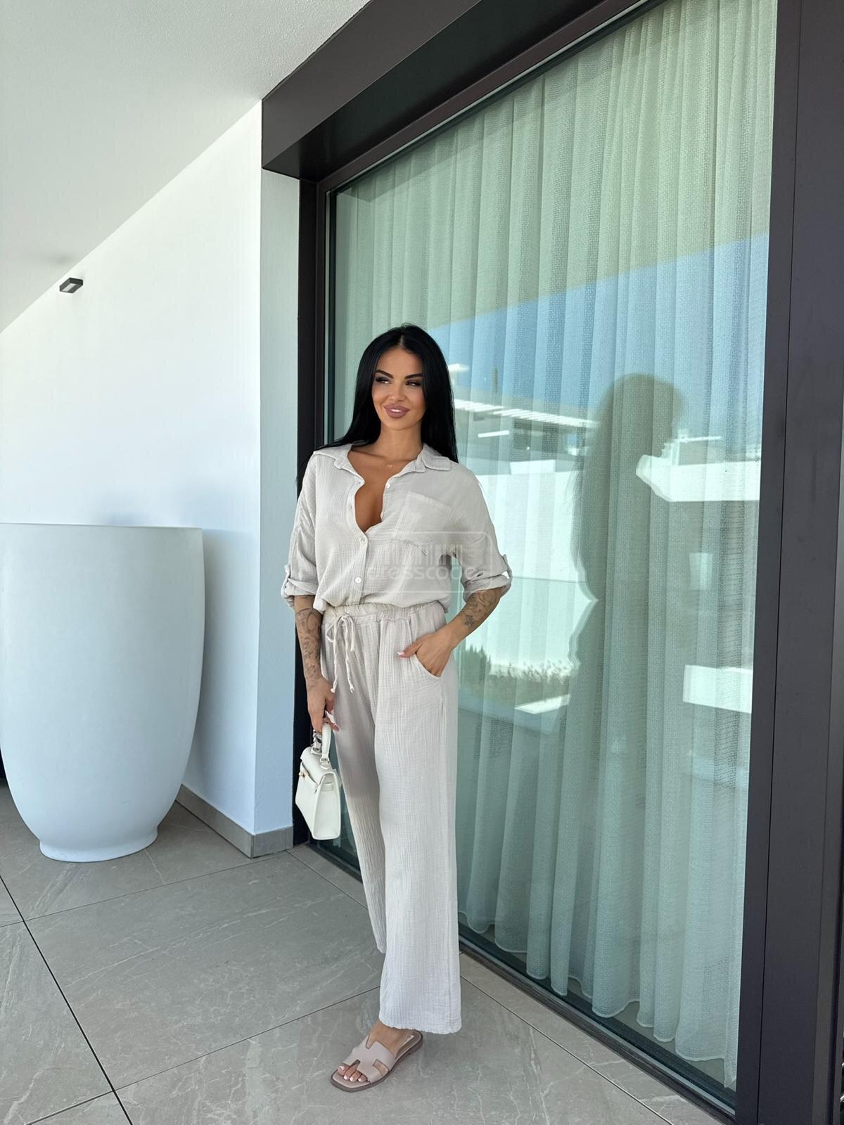 Súprava Marevino 2 v 1 je navrhnutá pre štýlový vzhľad a každodenné pohodlie. Vyrobená z mäkkého, priedušného mušelínu s výraznou textúrou, má neuveriteľne ľahký a moderný vzhľad. Voľná košeľa a nohavice so širokými nohavicami vytvárajú ucelený, minimalistický vzhľad, ktorý dokonale ladí so súčasnými trendmi.