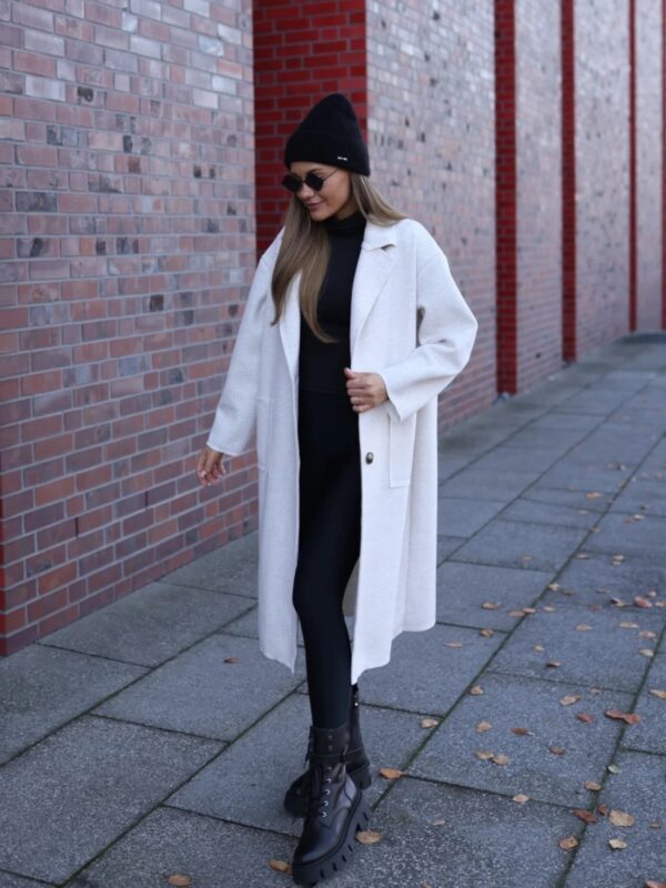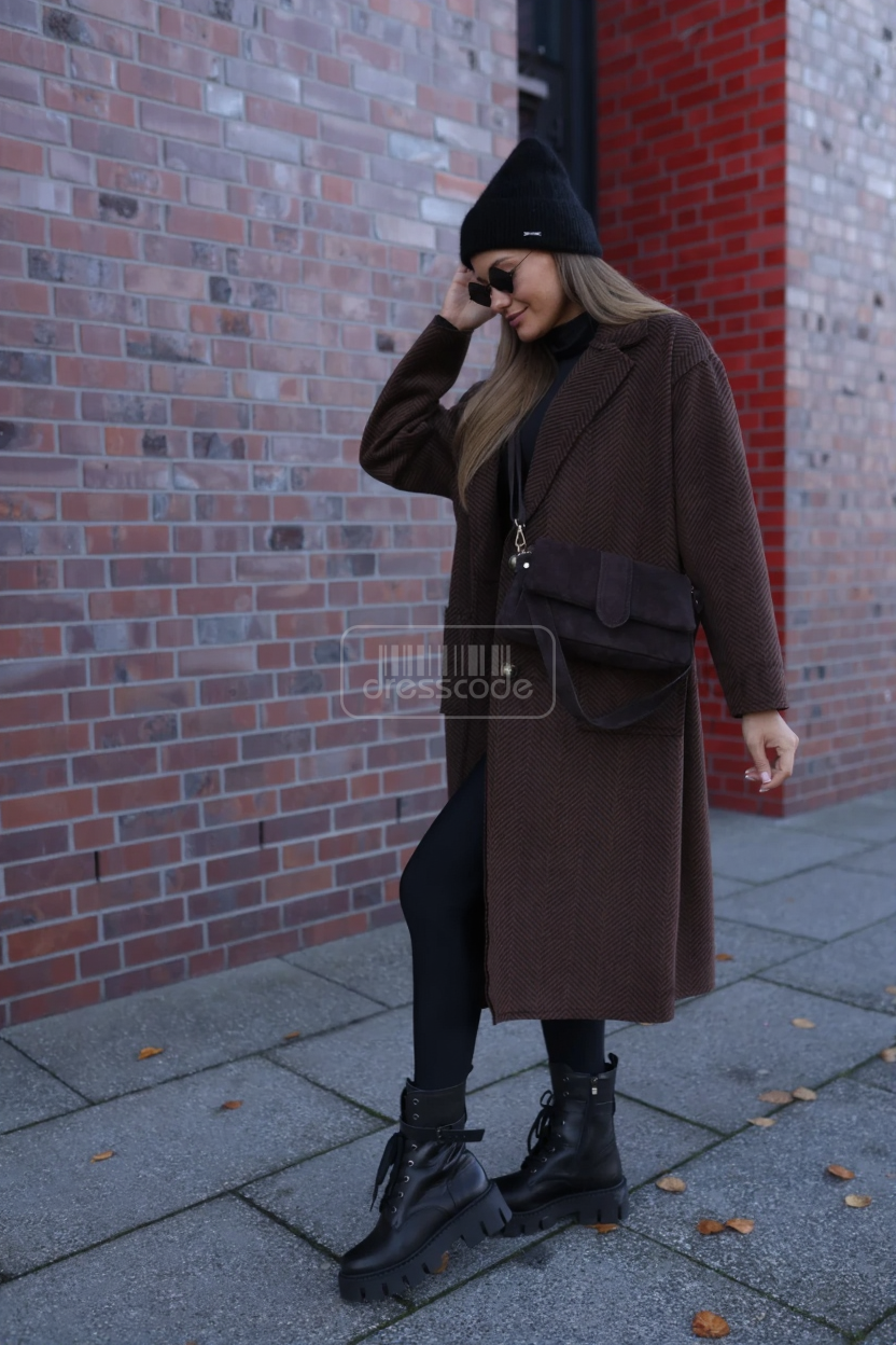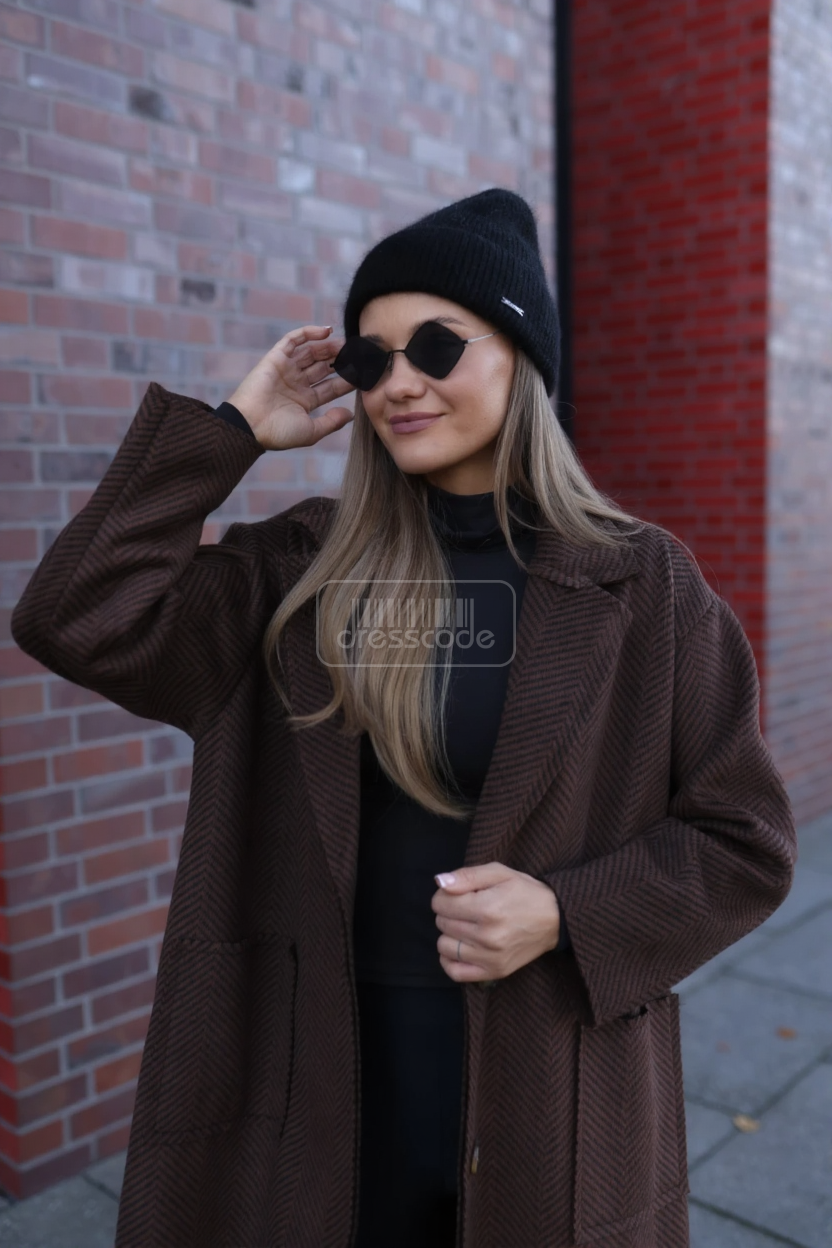 Tento štýlový kabát so vzorom rybej kosti je elegantnou voľbou na chladnejšie dni. Vďaka klasickému vzoru rybej kosti je dostupný v troch tlmených farbách a je ideálny pre ležérne aj formálnejšie outfity. Zapínanie na dva gombíky mu dodáva minimalistický a čistý vzhľad. Dve praktické bočné vrecká zaisťujú pohodlie a funkčnosť, zatiaľ čo klasický golier zdôrazňuje nadčasový charakter kabáta.