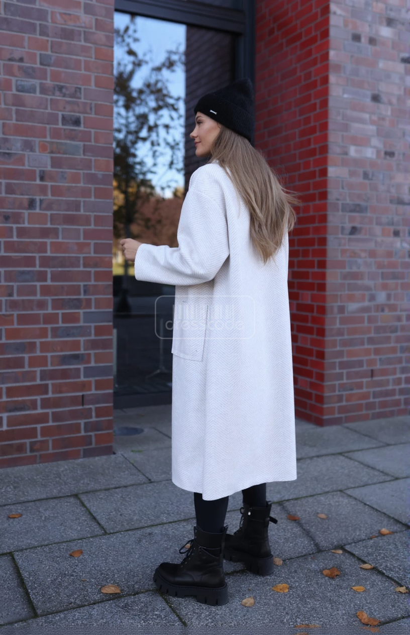 Tento štýlový kabát so vzorom rybej kosti je elegantnou voľbou na chladnejšie dni. Vďaka klasickému vzoru rybej kosti je dostupný v troch tlmených farbách a je ideálny pre ležérne aj formálnejšie outfity. Zapínanie na dva gombíky mu dodáva minimalistický a čistý vzhľad. Dve praktické bočné vrecká zaisťujú pohodlie a funkčnosť, zatiaľ čo klasický golier zdôrazňuje nadčasový charakter kabáta.