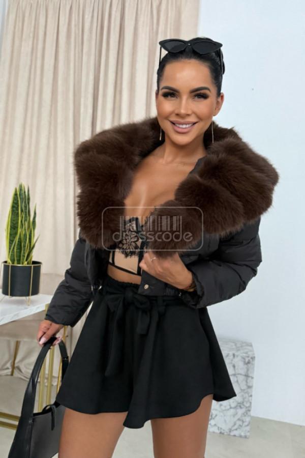 – Krátka čierna páperová bunda so svetlým kožušinovým lemom
