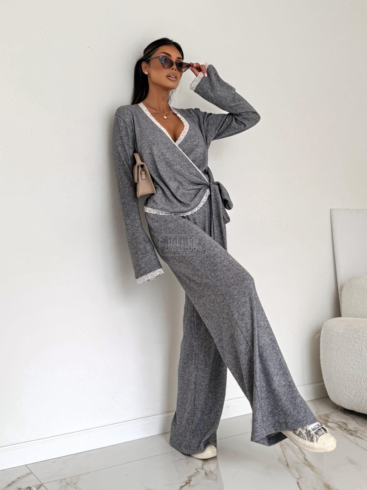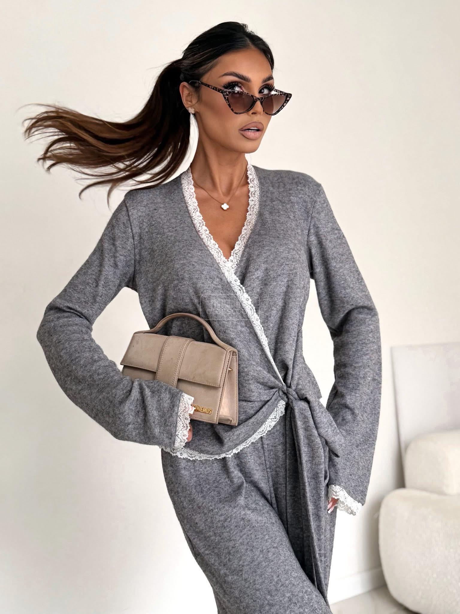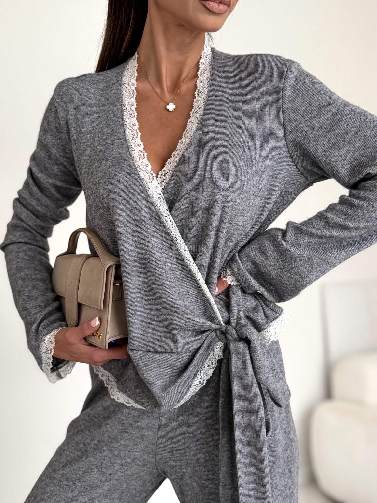 Súprava  2 v 1 je pohodlná dámska súprava vyrobená z mäkkého materiálu. Blúzka so zaväzovaním zakončená jemnou čipkou dodáva súprave mierne ženský nádych, ideálna na každodenné nosenie, stretnutia s priateľmi a neformálne výlety.