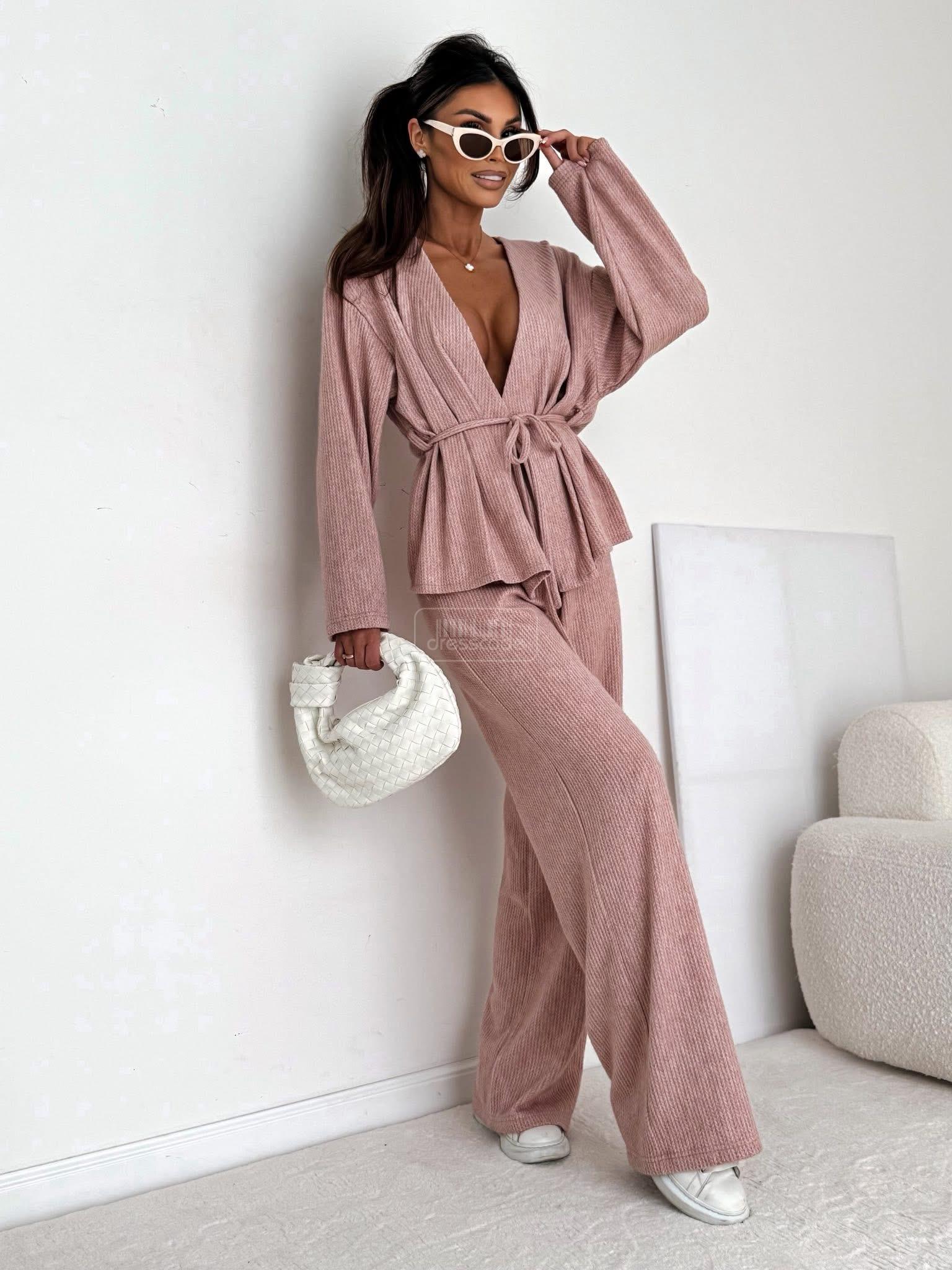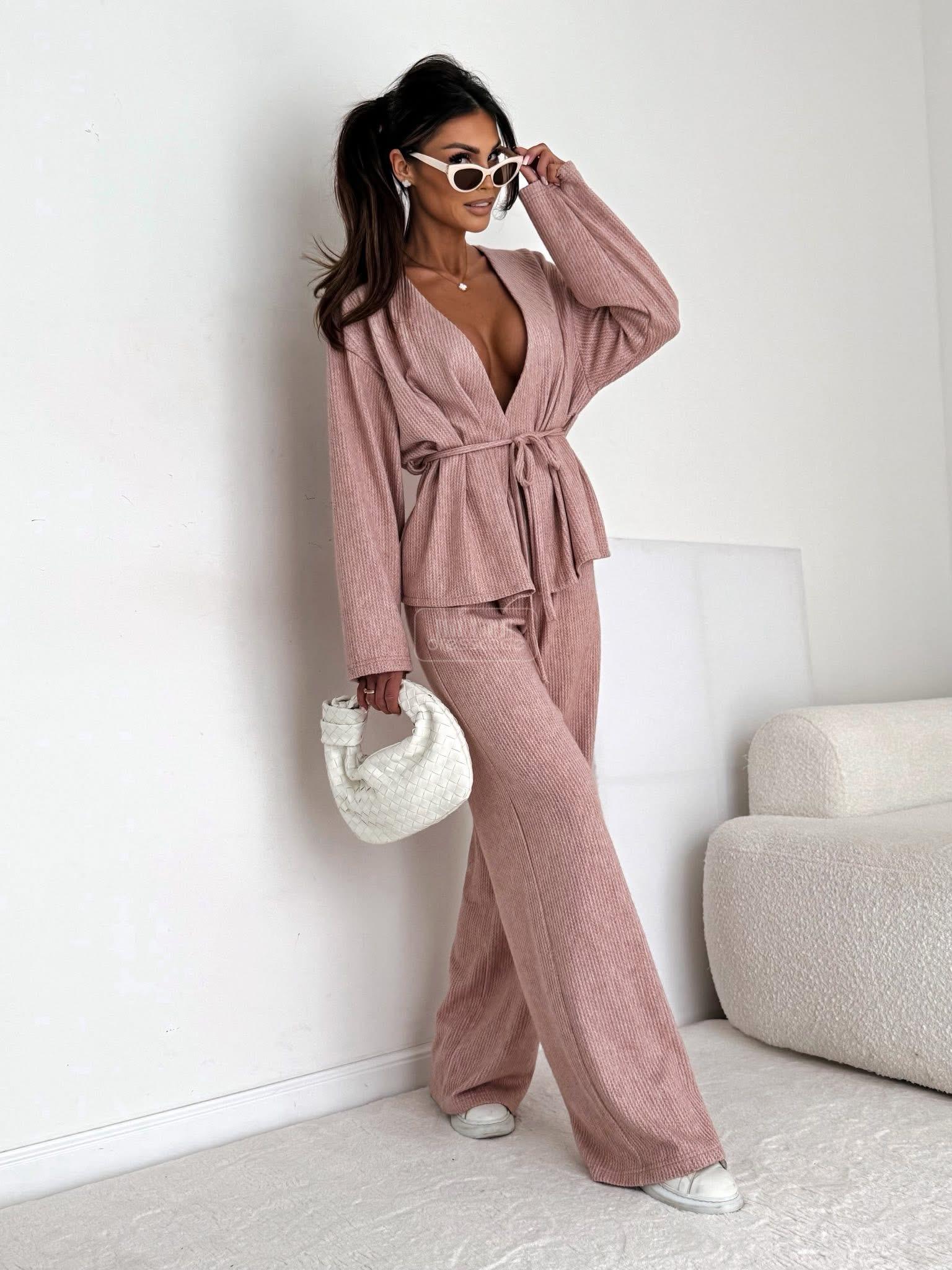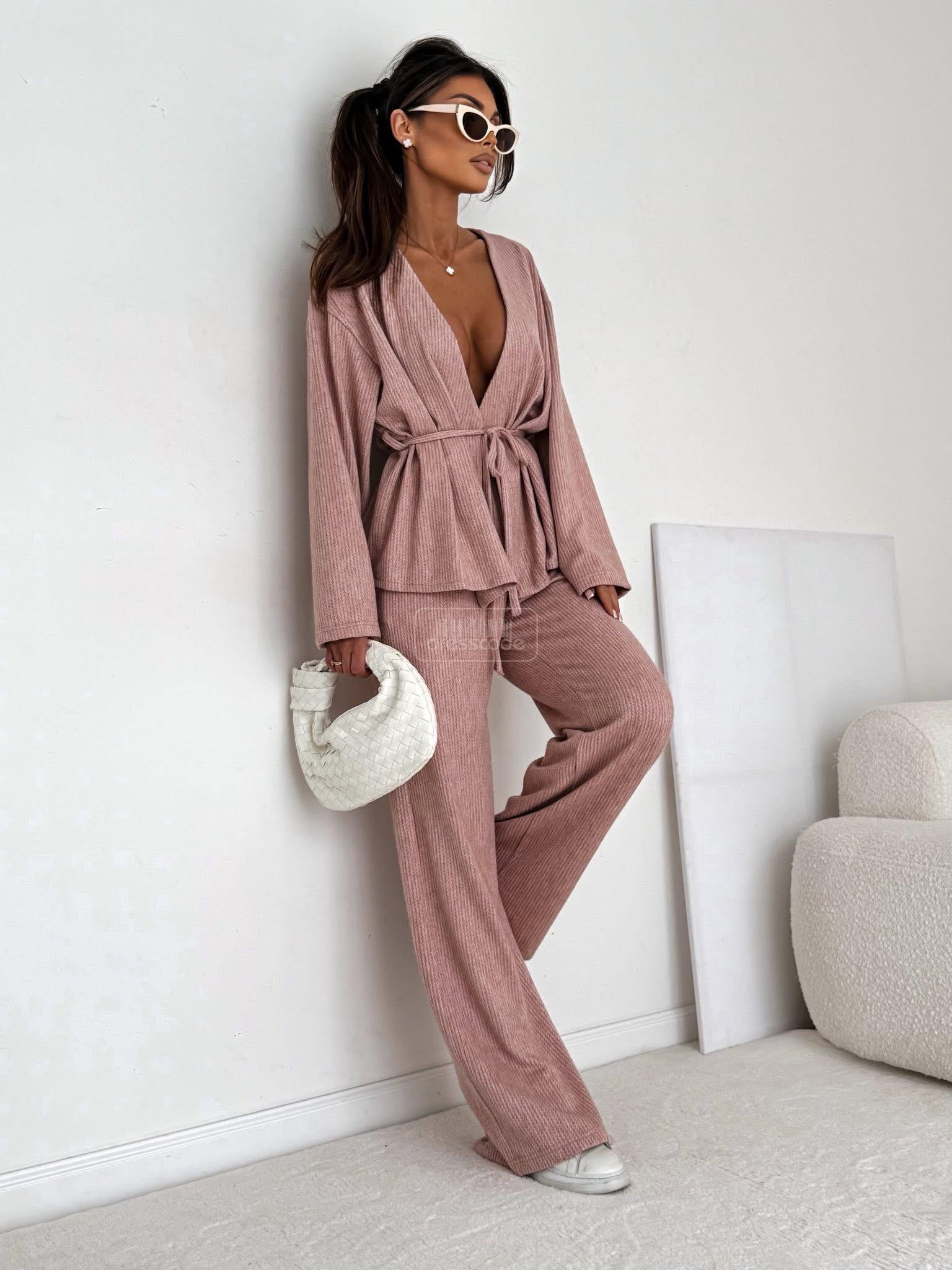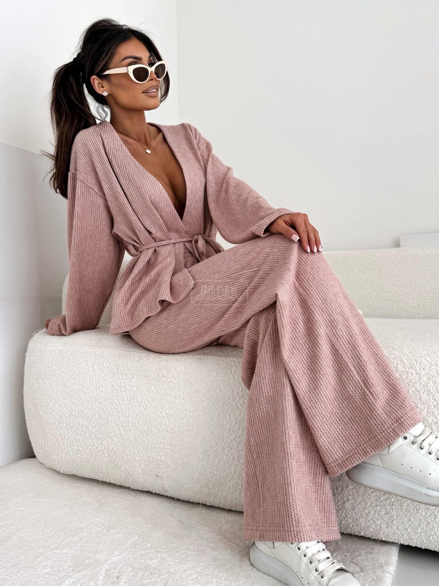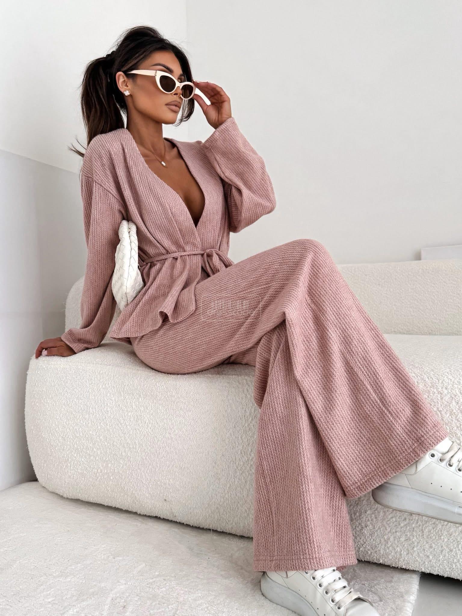 Štýlový a pohodlný komplet so širokými nohavicami a zaväzovaním v páse – ideálny na každú príležitosť. Tento priliehavý overal kombinuje eleganciu s každodenným pohodlím.