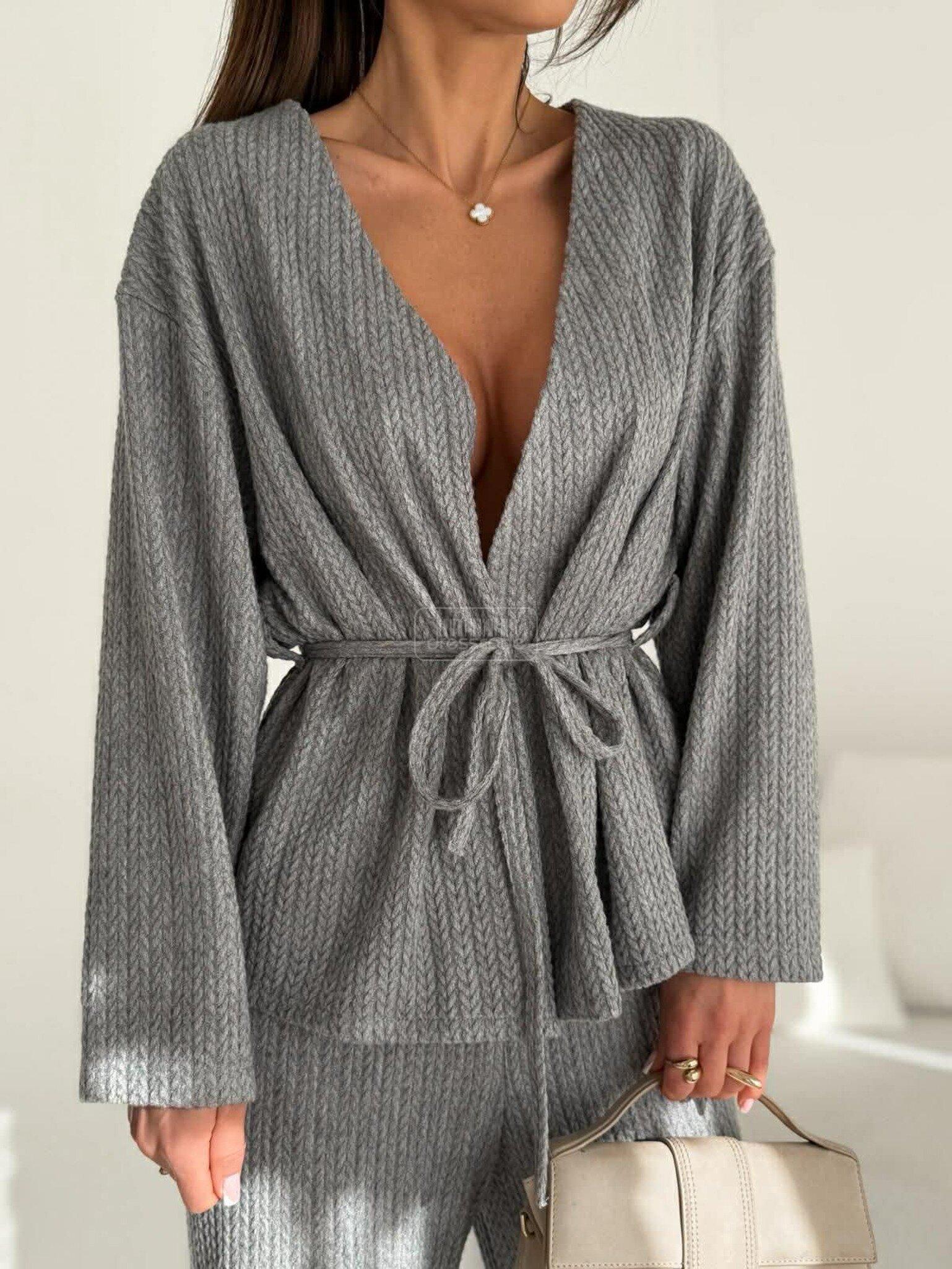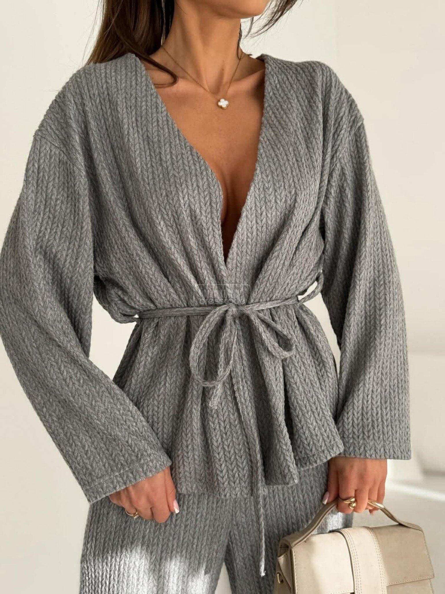 Štýlový a pohodlný komplet so širokými nohavicami a zaväzovaním v páse – ideálny na každú príležitosť. Tento priliehavý overal kombinuje eleganciu s každodenným pohodlím.