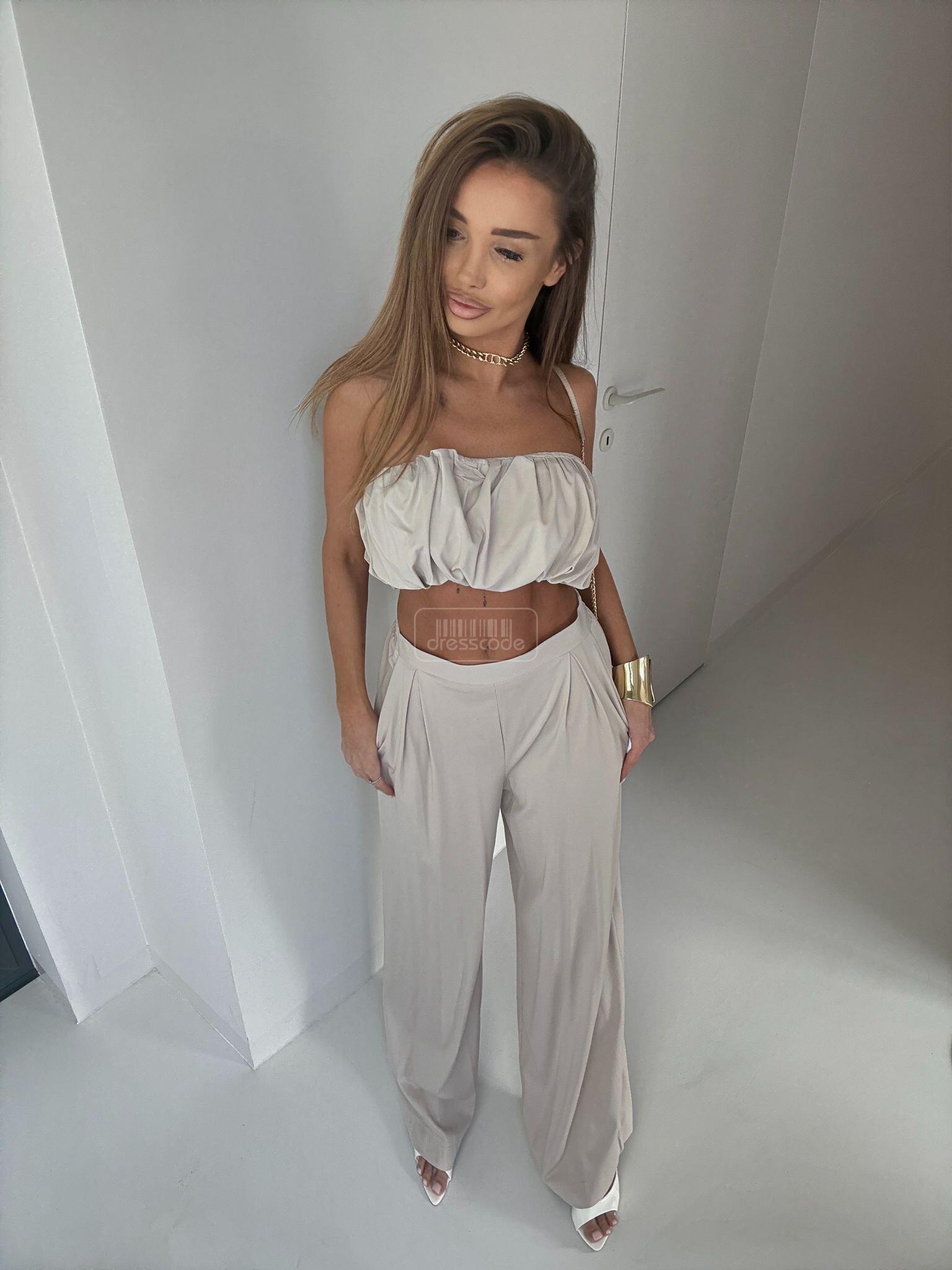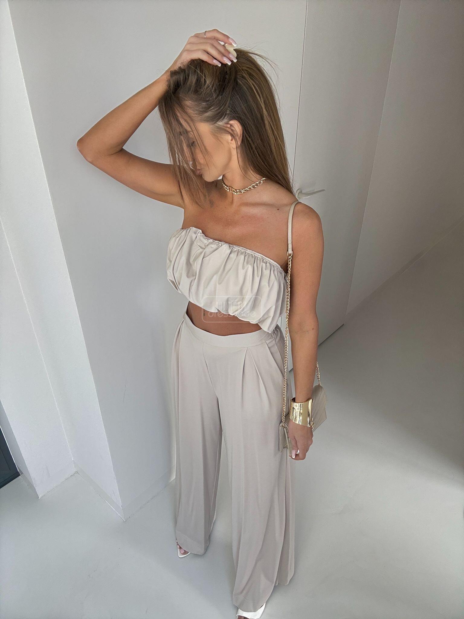 Súprava 2 v 1 je štýlový, ľahký a neuveriteľne ženský outfit vyrobený z mäkkej, vzdušnej viskózy. Skrátený top sa pýši jedinečným, štruktúrovaným volánom, ktorý mu dodáva moderný nádych a krásne zvýrazňuje ramená. Nohavice s vysokým pásom a širokými nohavicami dokonale tvarujú postavu, opticky predlžujú nohy a zaisťujú maximálne pohodlie. Súprava Armon je ideálna na leto, dovolenky, stretnutia s priateľmi a elegantné minimalistické štýly. -Skrátený top s výraznými, štruktúrovanými volánikmi