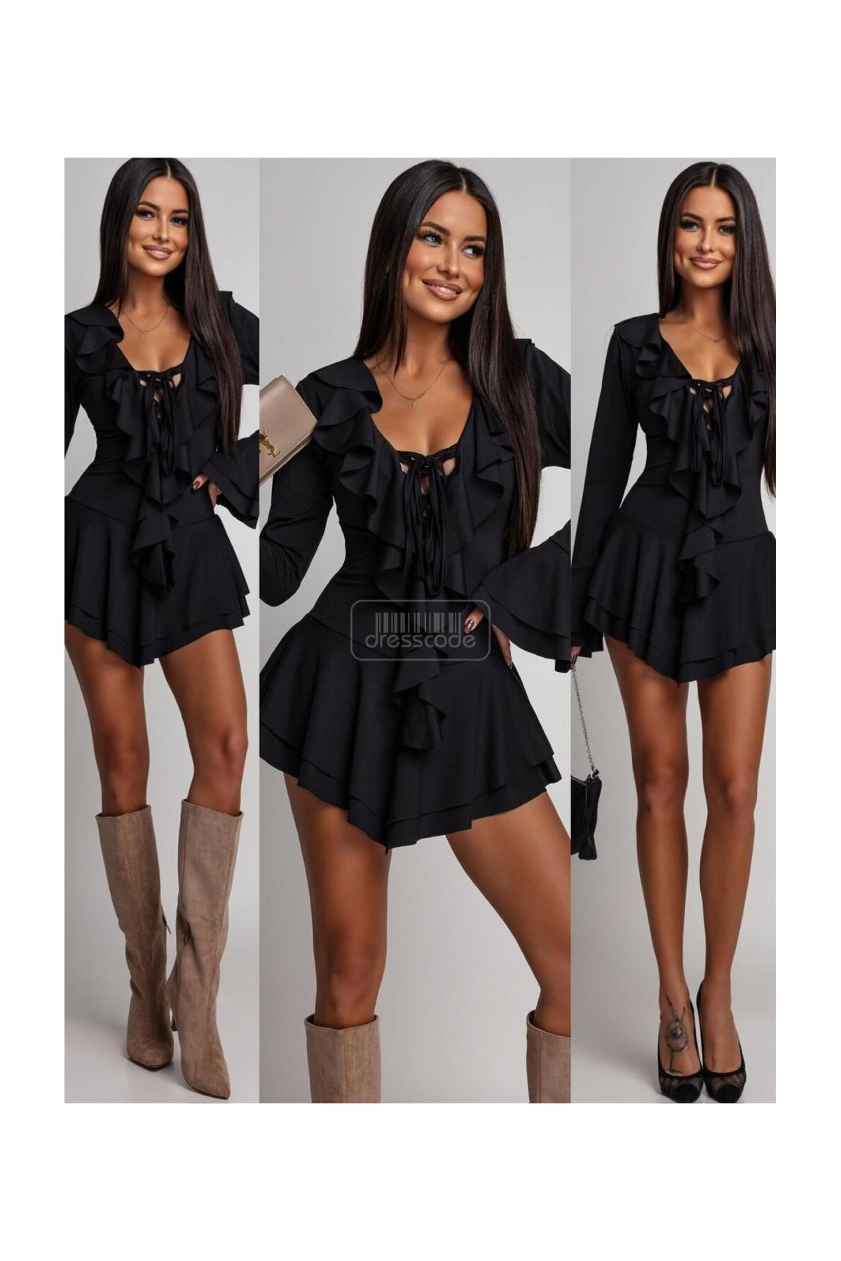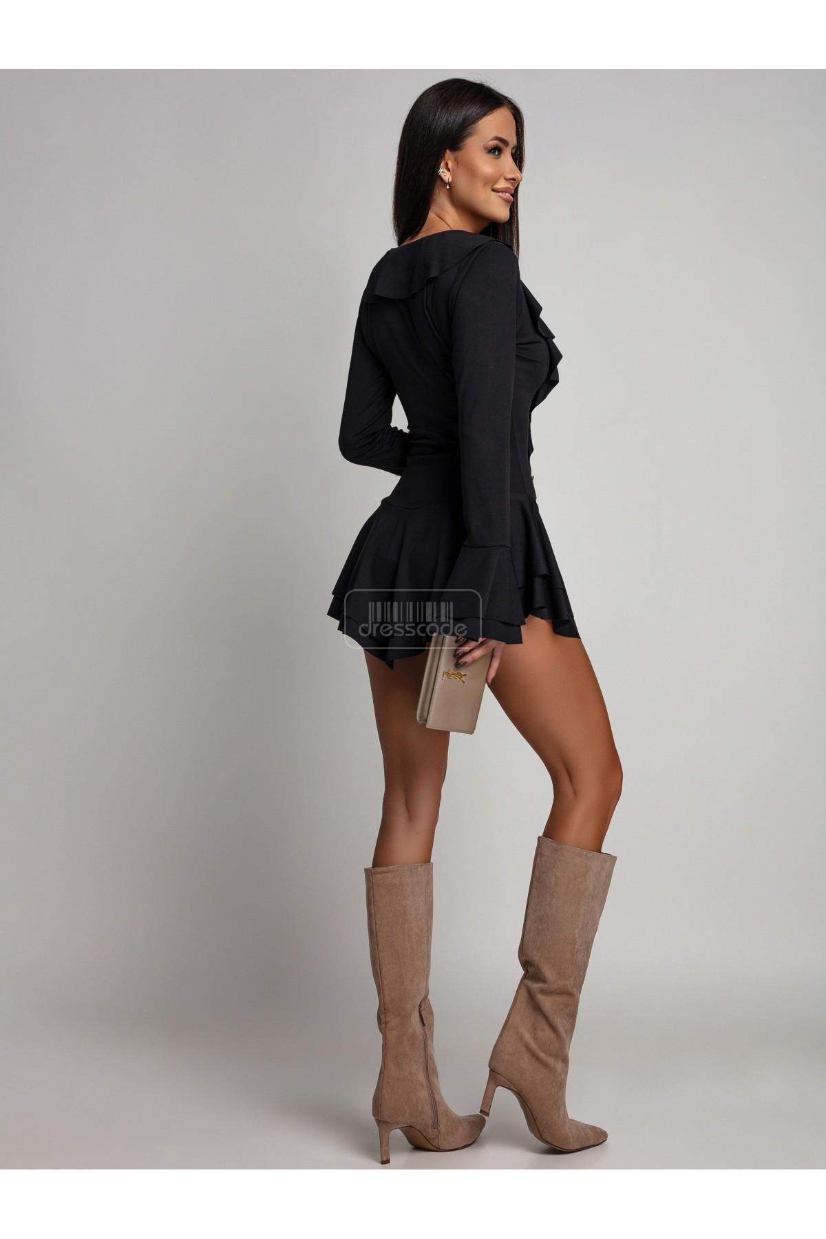 Tento dámsky krátky overal je dokonalou zmesou ľahkosti, ženskosti a moderného dizajnu. Roztiahnuté nohavice mu dodávajú ležérny nádych, zatiaľ čo volániky vpredu dodávajú jemný šarm a nádych vizuálnej ľahkosti.