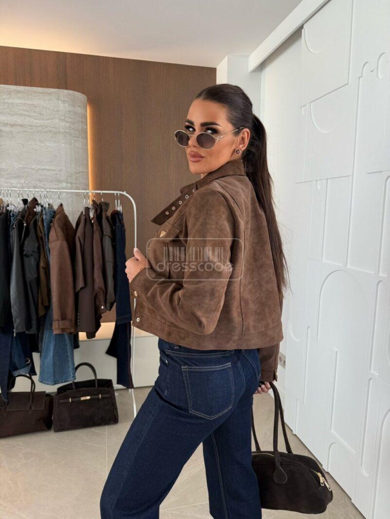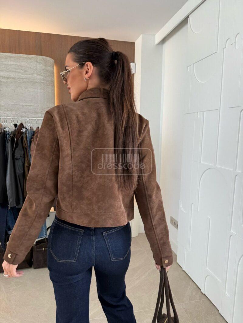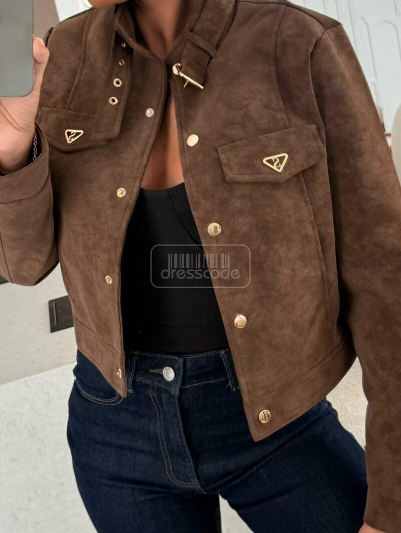Táto dámska semišová bunda je kombináciou elegancie a praktickosti. Zlaté patenty a ozdobné vrecká na hrudi dodávajú klasickému dizajnu moderný nádych.