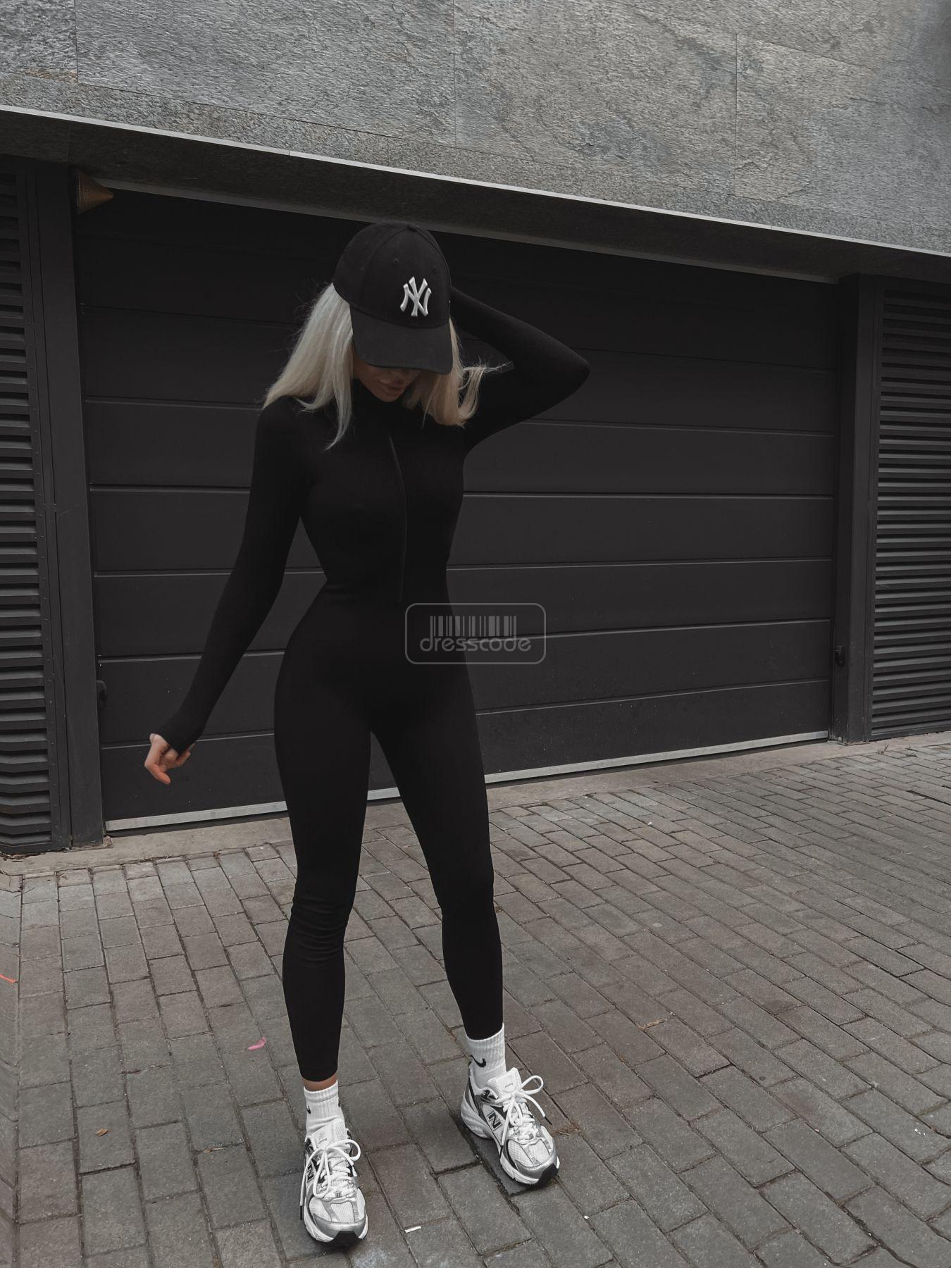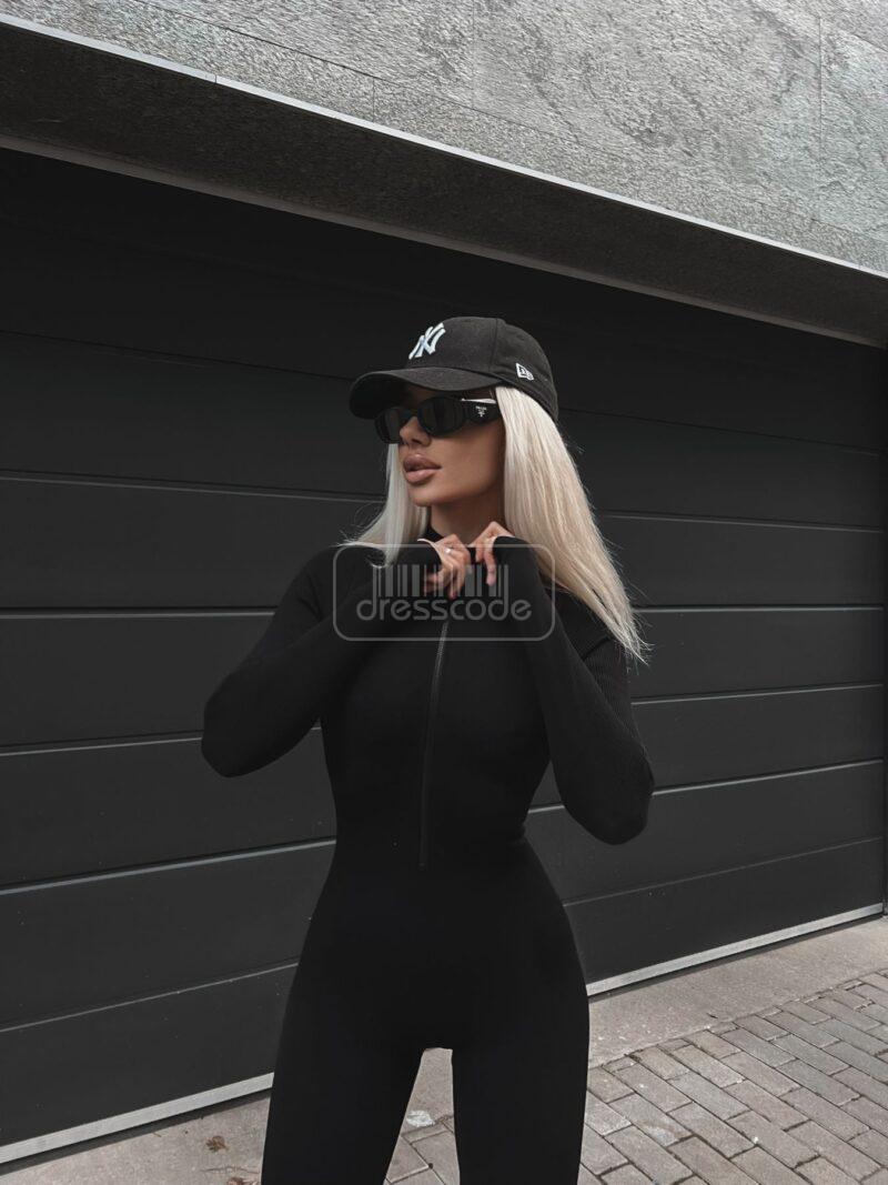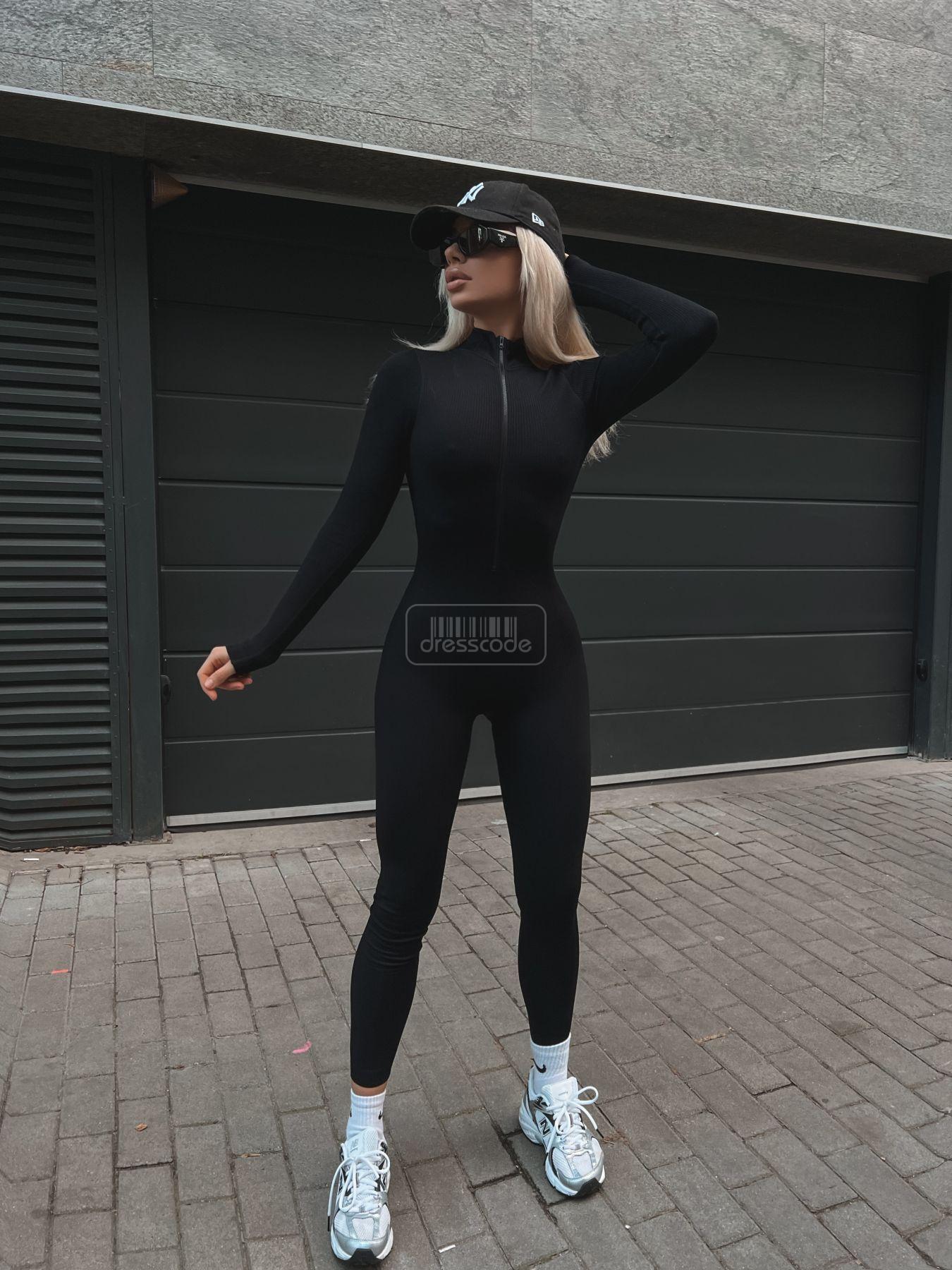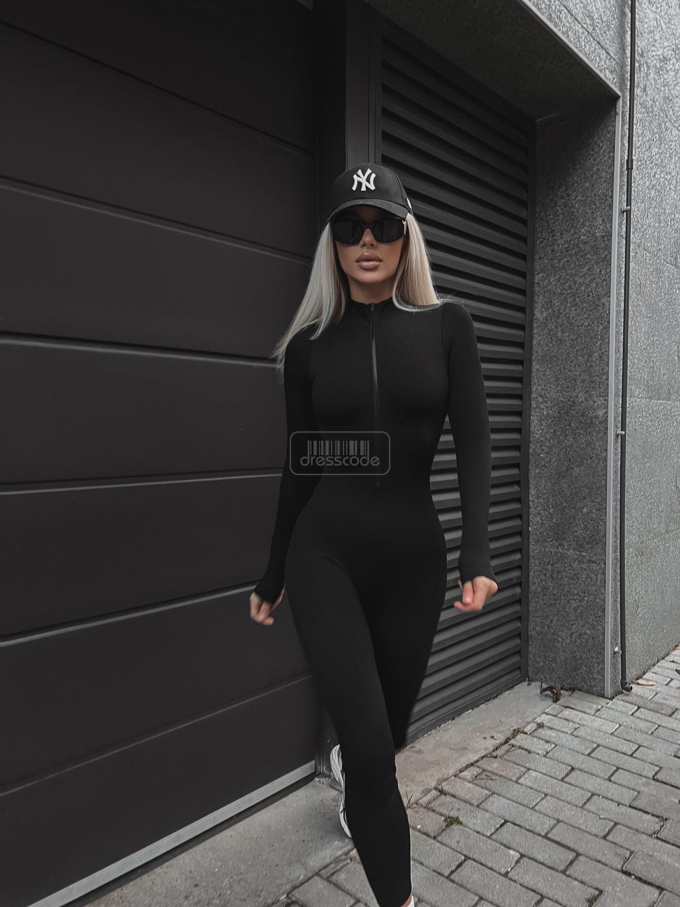 Čierny overal z vrúbkovanej látky je perfektnou voľbou pre vytvorenie pohodlného vzhľadu. Náš návrh rozhodne prilieha k telu, dokonale podčiarkne prednosti postavy. Skvele sa bude hodiť k členkovým čižmám a koženej motorkárskej bunde.