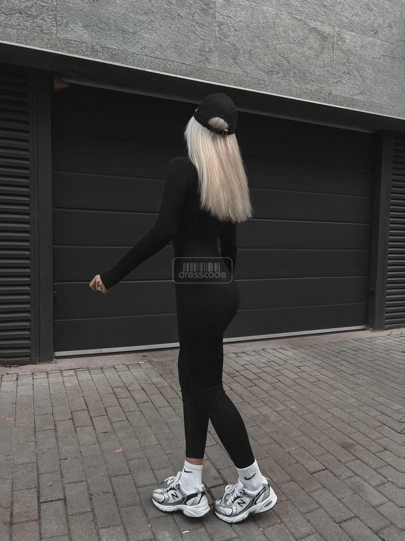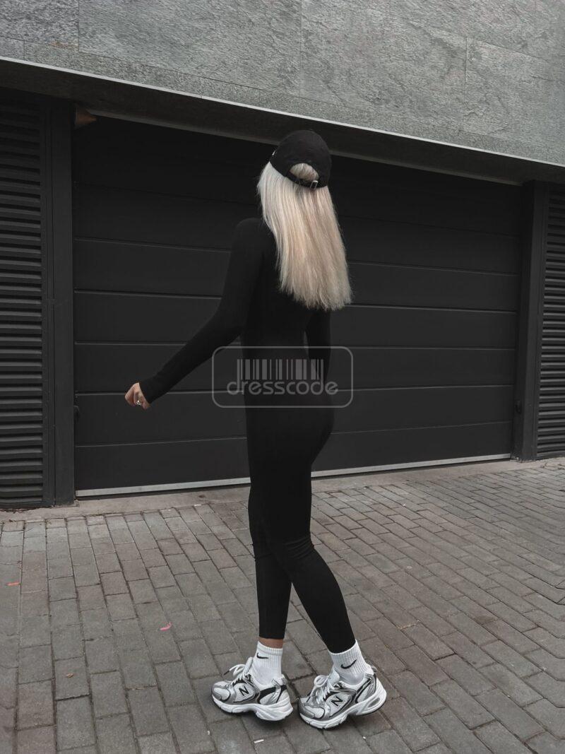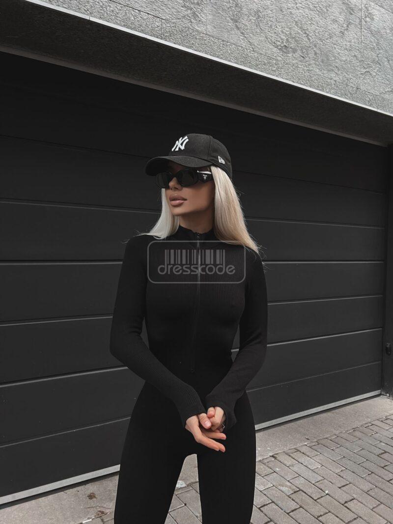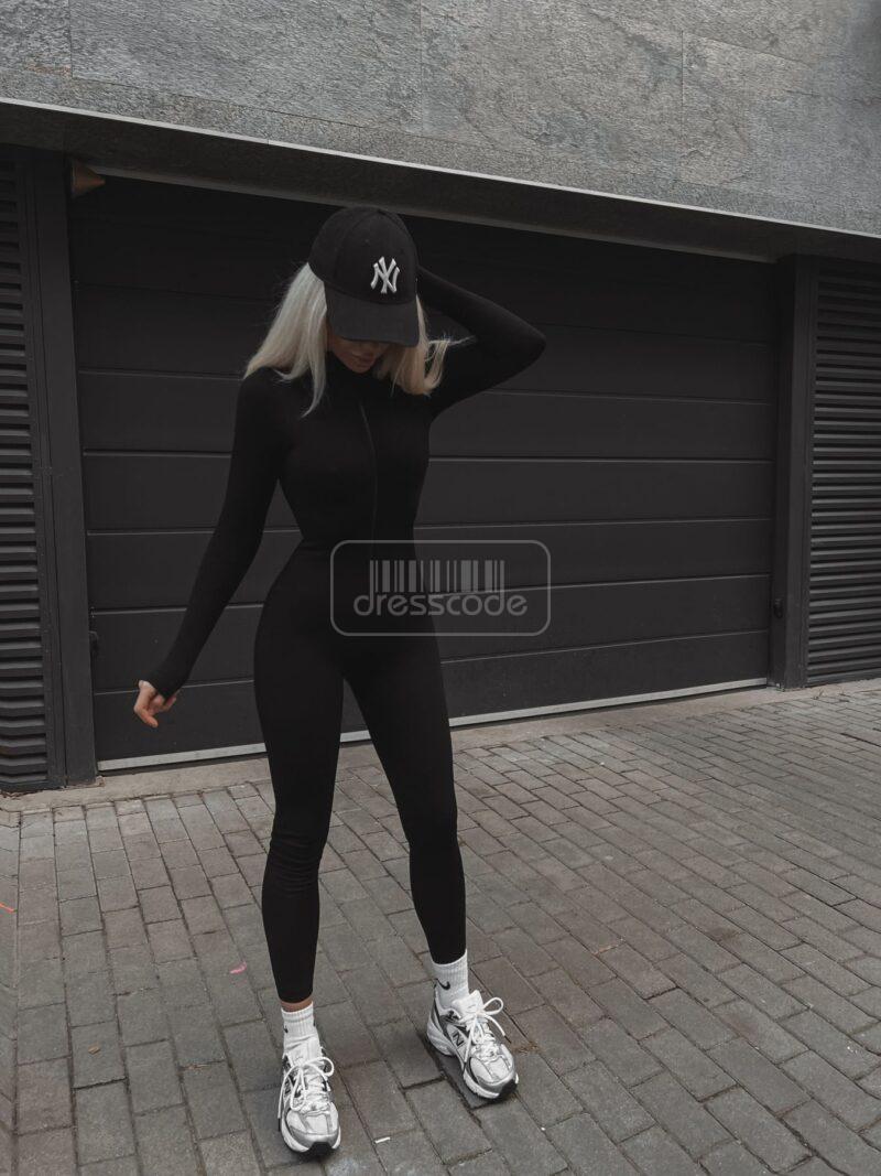 Čierny overal z vrúbkovanej látky je perfektnou voľbou pre vytvorenie pohodlného vzhľadu. Náš návrh rozhodne prilieha k telu, dokonale podčiarkne prednosti postavy. Skvele sa bude hodiť k členkovým čižmám a koženej motorkárskej bunde.