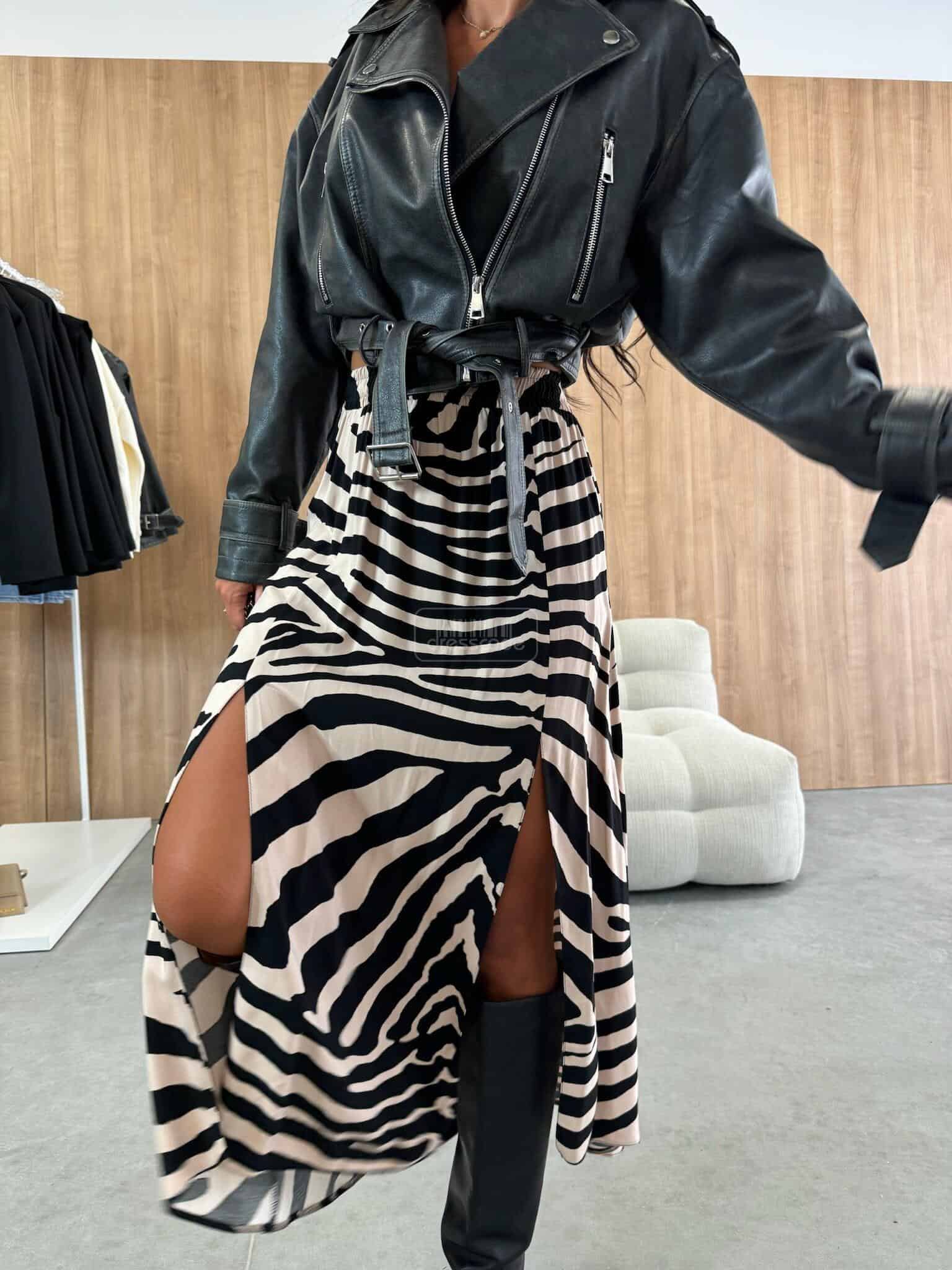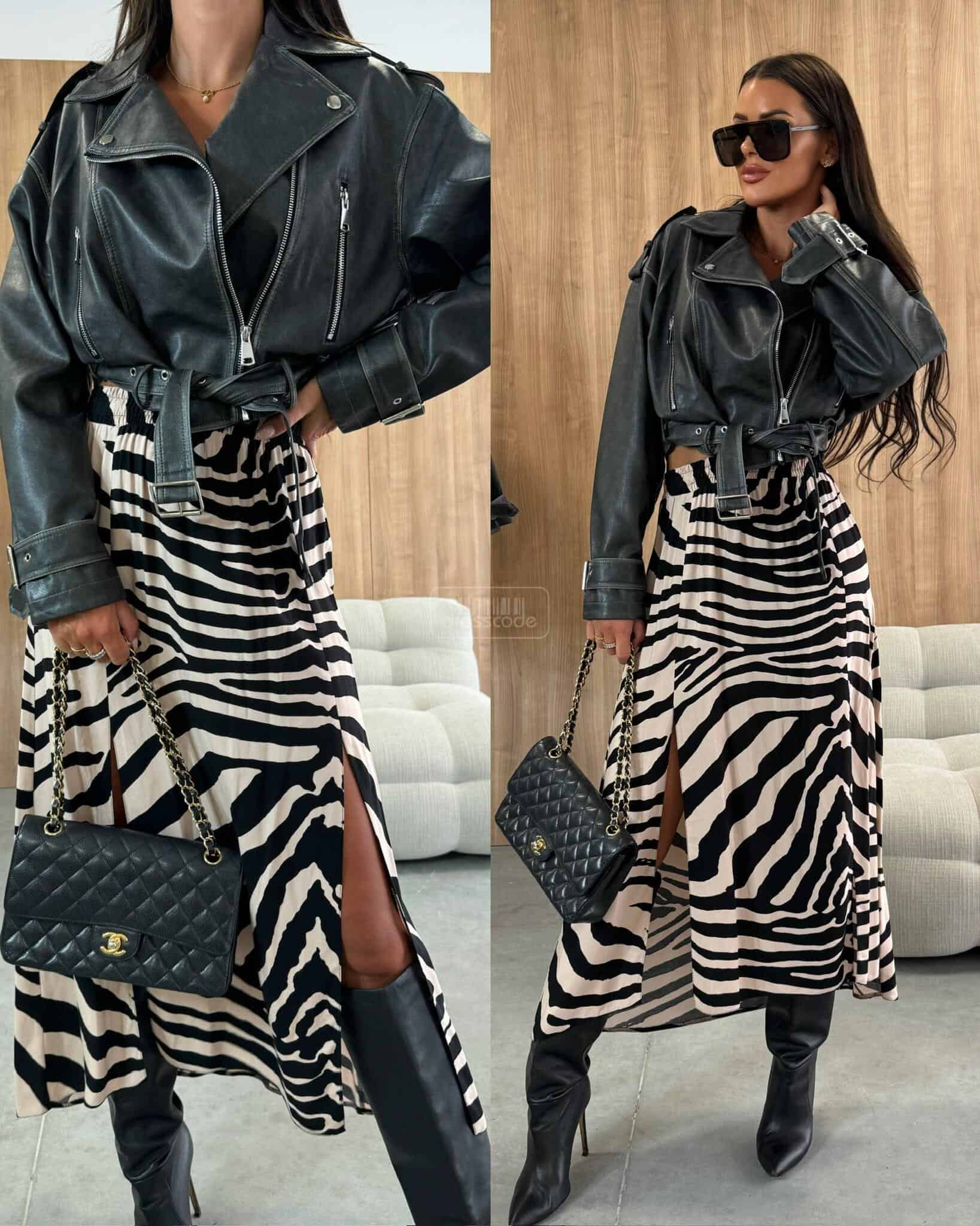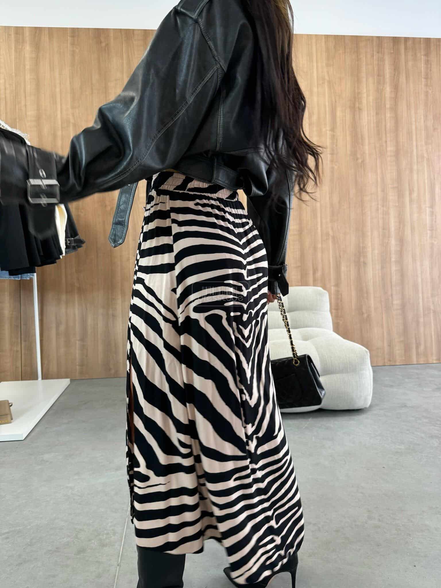 Midi dĺžka, zvýraznený pás s elastickým pásom. Módny vzor materiálu. Prestrihnutie v dolnej časti na dvoch miestach.