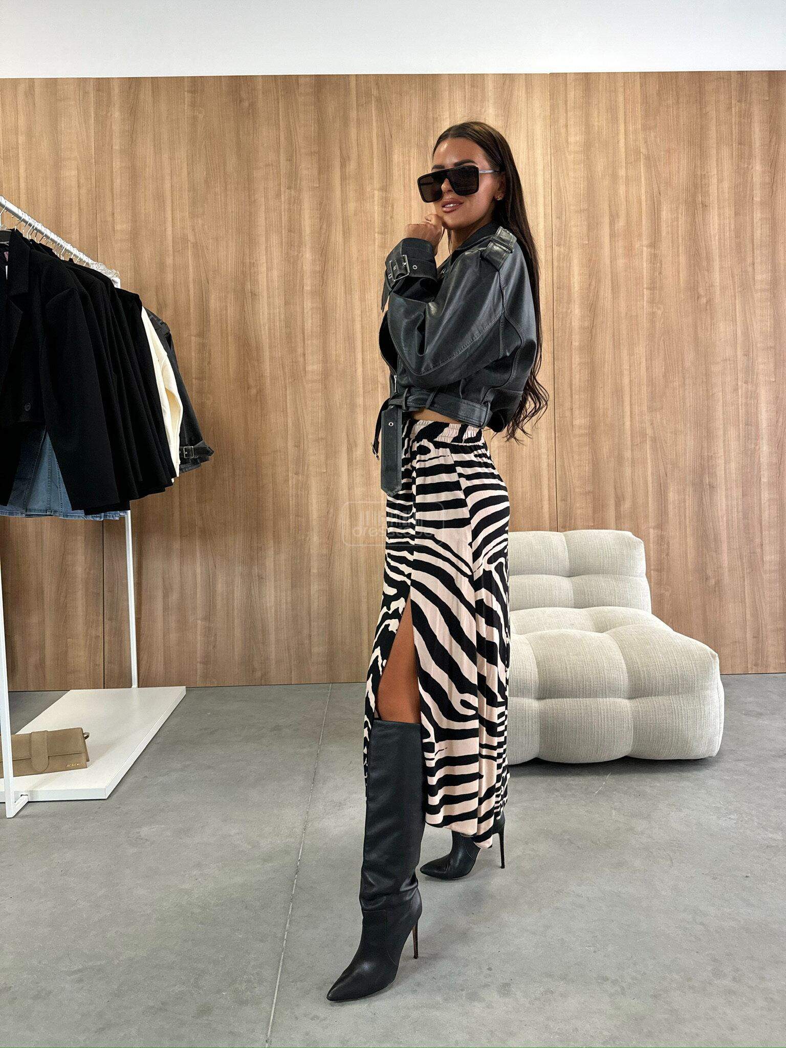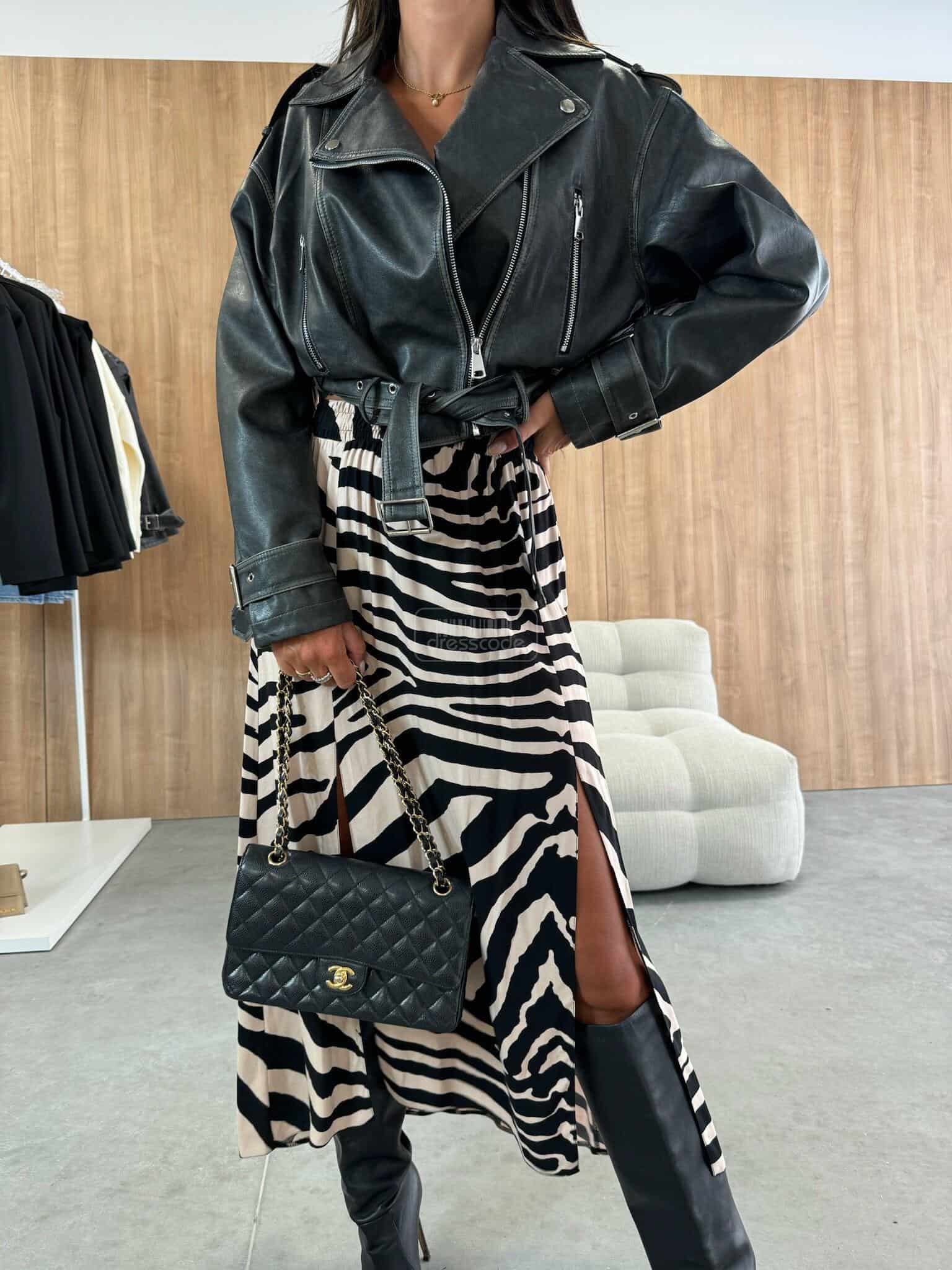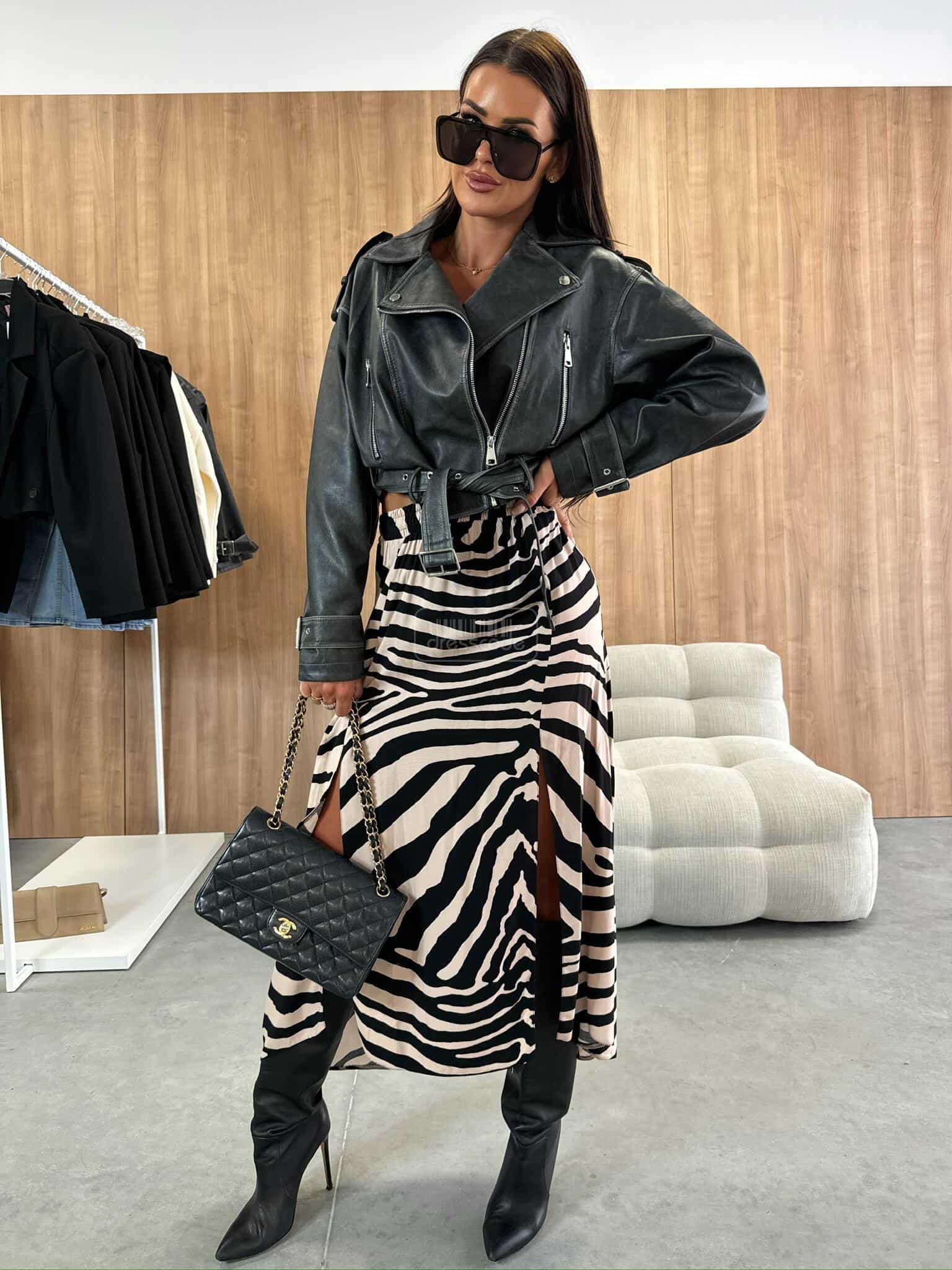 Midi dĺžka, zvýraznený pás s elastickým pásom. Módny vzor materiálu. Prestrihnutie v dolnej časti na dvoch miestach.