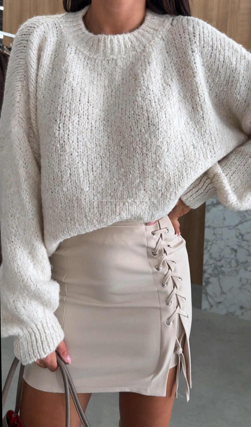 Sveter s hrubším úpletom a voľnejším strihom. Nafúknuté rukávy.